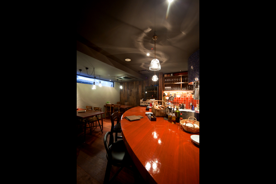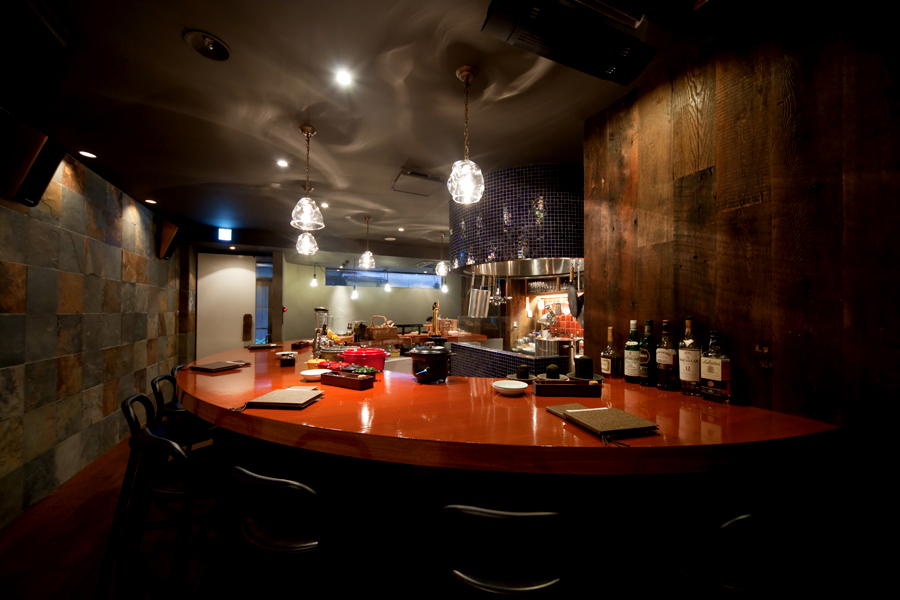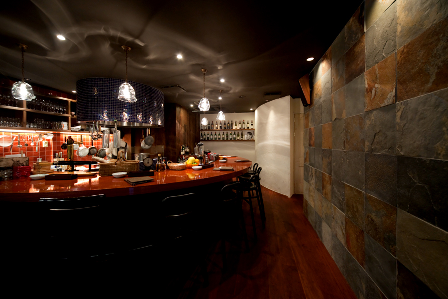 新潟古町のイタリアン・フレンチ。まるでギャラリーにいるかのような雰囲気の店内。舞台さながらに目の前でシェフの調理を楽しめる円形カウンター。
