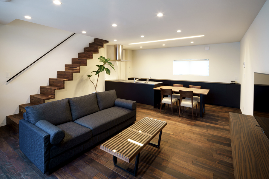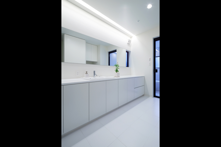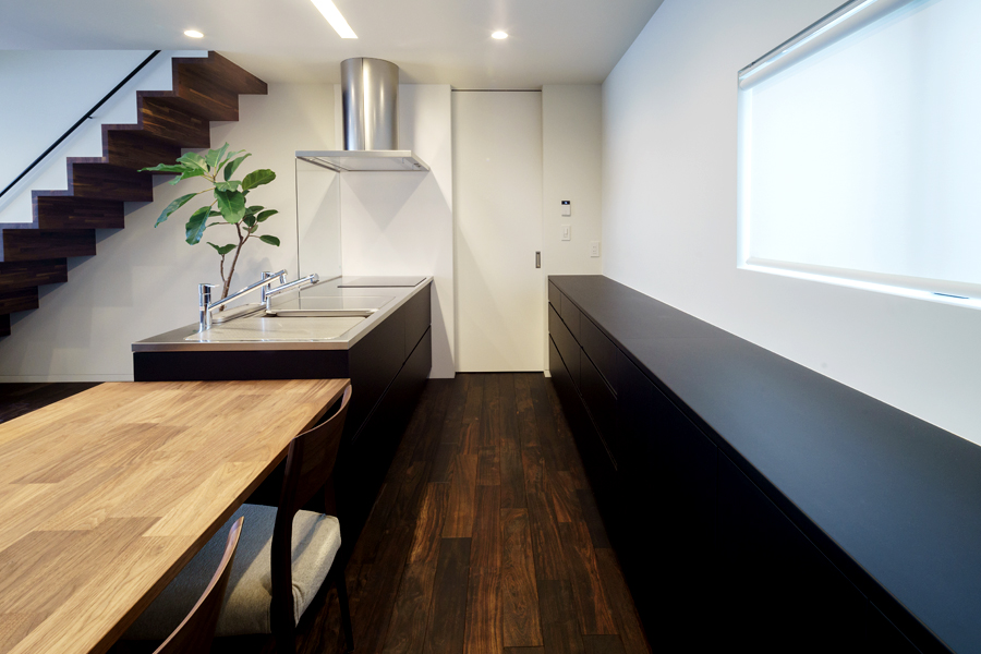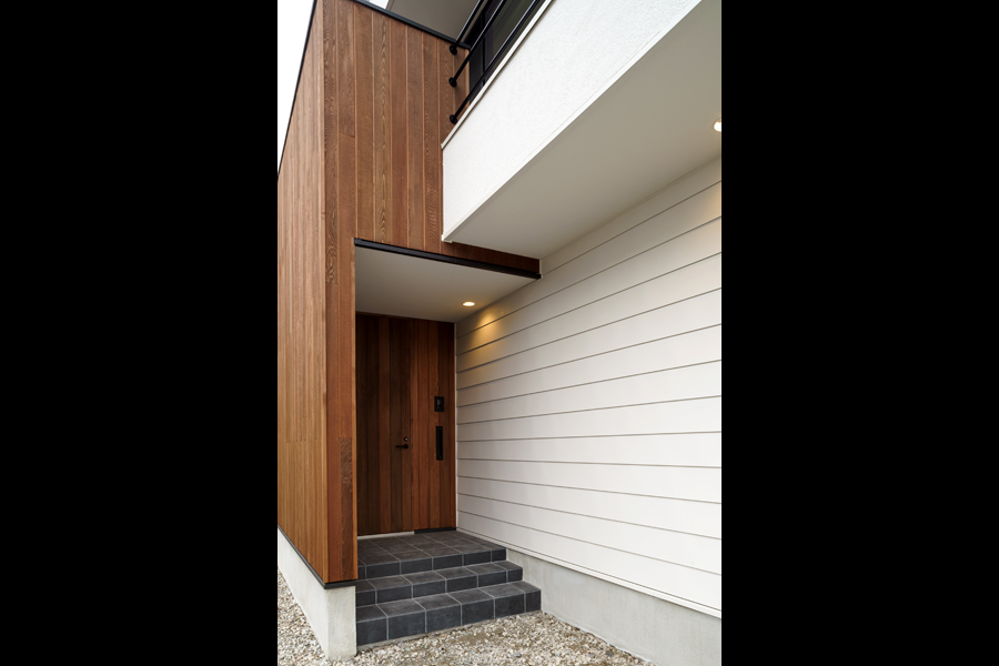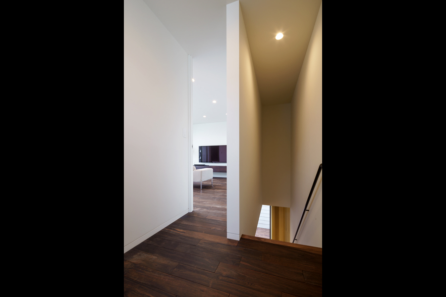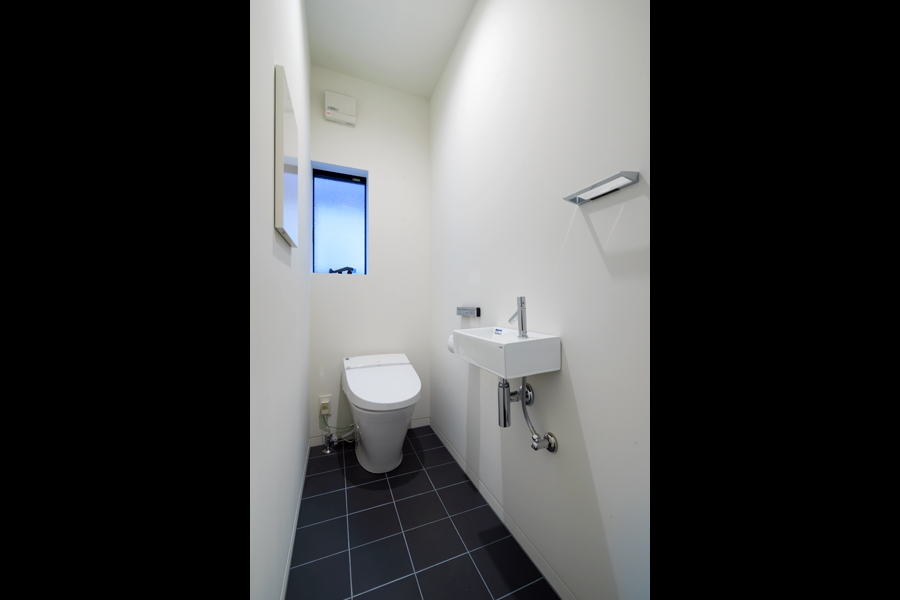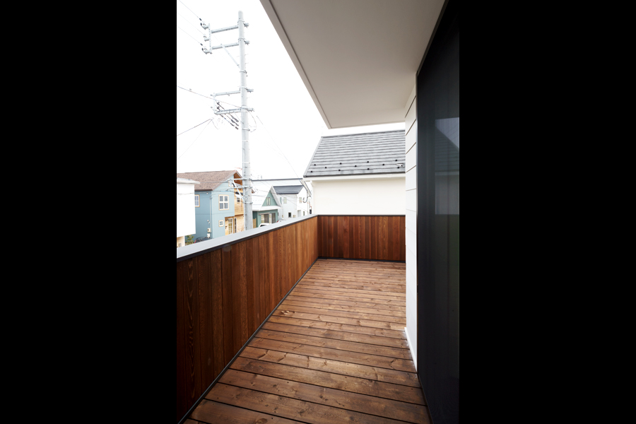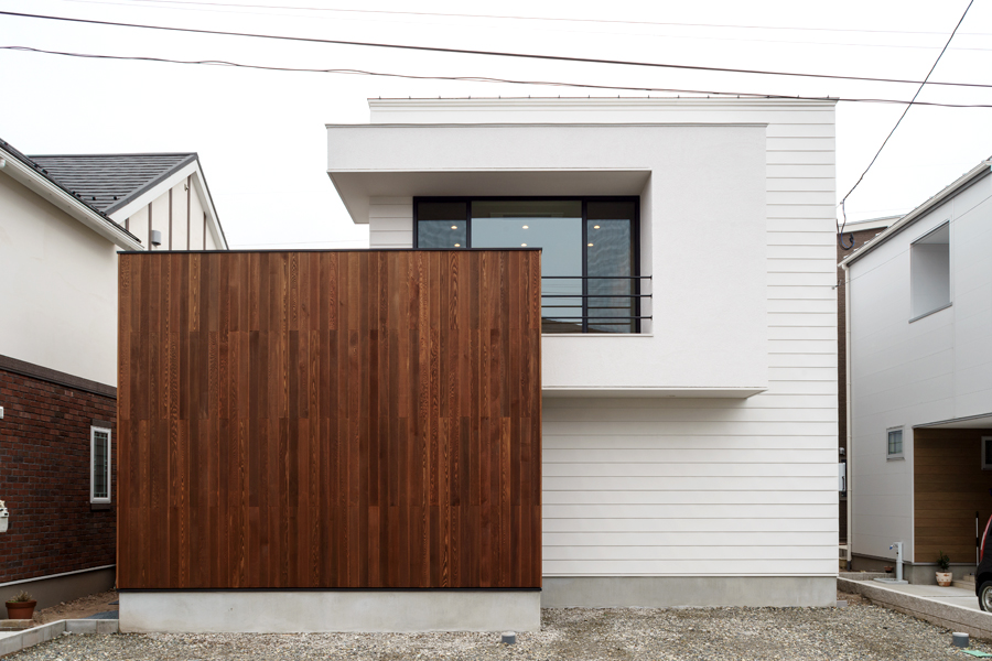 敷地は47坪の分譲地。既に隣接して建物が建っている。外部からのプライバシーに配慮し、十分な光と風を採り入れる事を計画した。1Fには、東南の位置にテラスを設け、20帖程のLDK、6帖の個室を隣接して計画した。テラスは壁で囲まれており外部の視線を感じることなくそれぞれの部屋に採光と通風を確保し開放感を与えている。キッチンはオリジナルで製作したキッチンと食器収納を設置。食品庫を隣接させ収納を確保。洗面室にもオリジナルで製作した洗面台を設置し違和感なく空間に溶込んでいる。玄関には十分な広さのシュークローズを計画しシューズ以外も収納可能。2Fには、セカンドリビング、寝室、ウォークインクローゼット、個室を配置。セカンドリビングには大きな開口部を設け、バルコニーを隣接させ採光と通風を確保した。外壁には3種類の外装材を使用し、外観に動きを与えている。