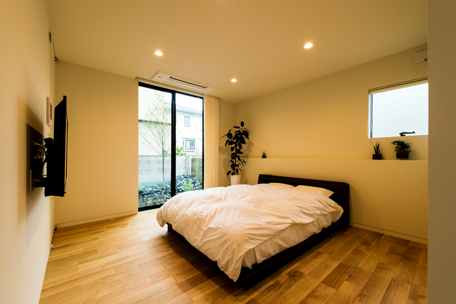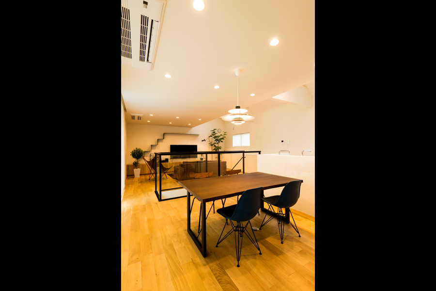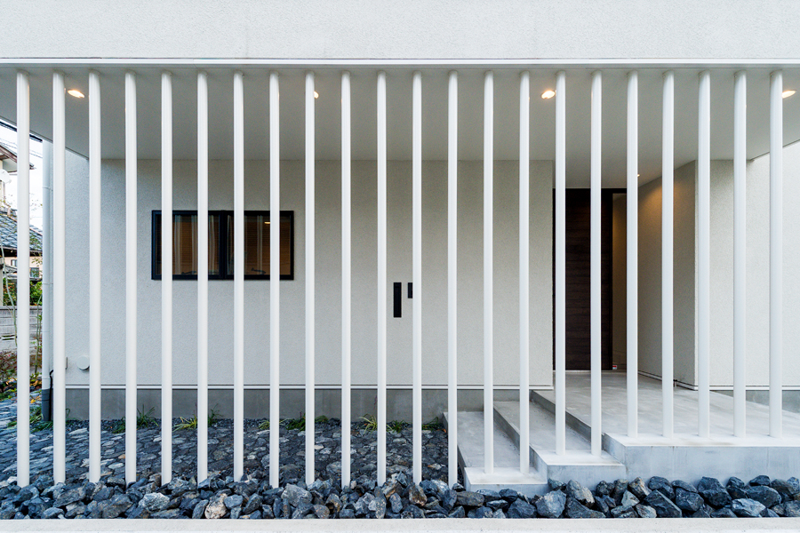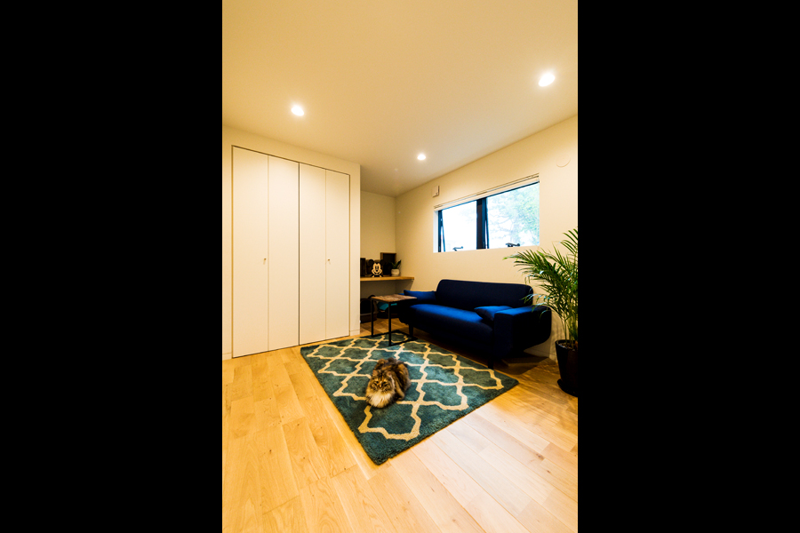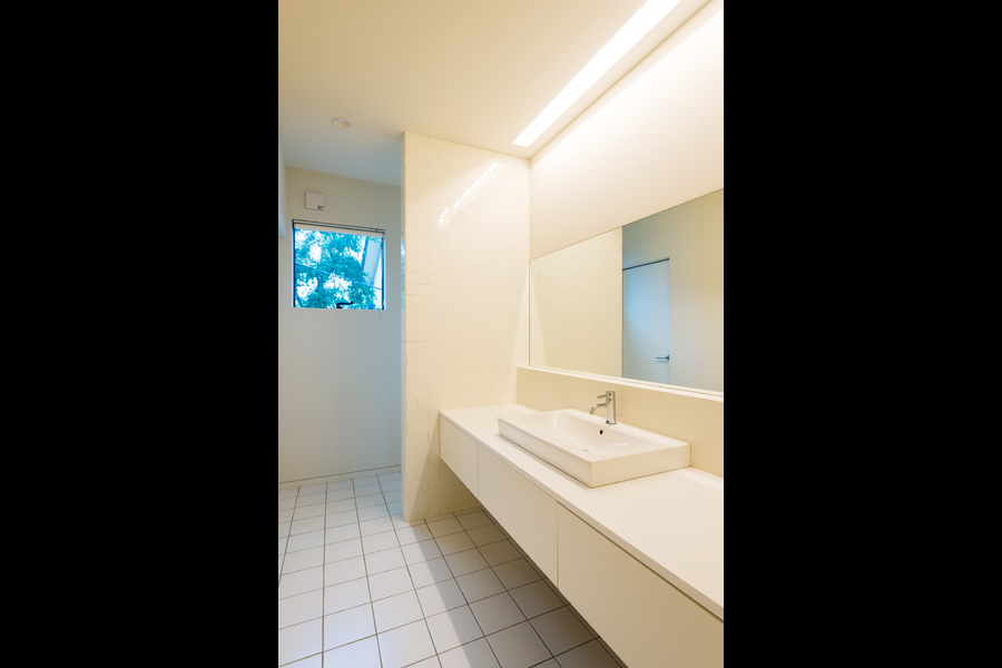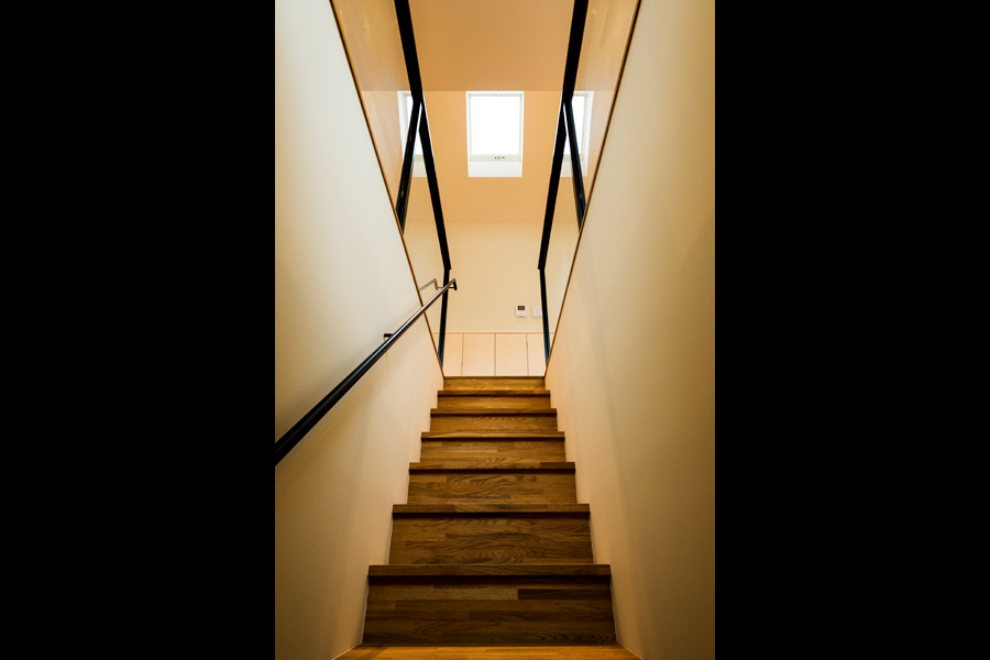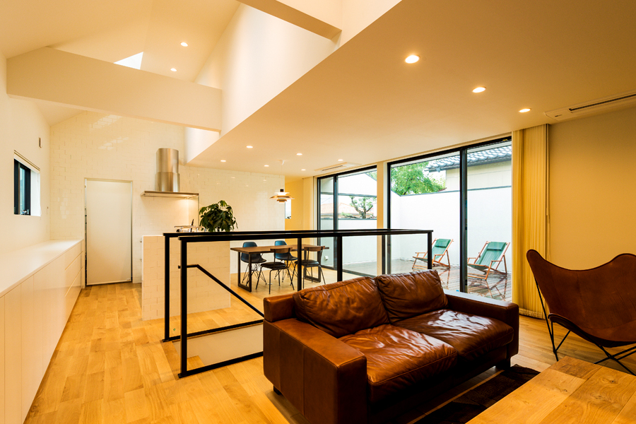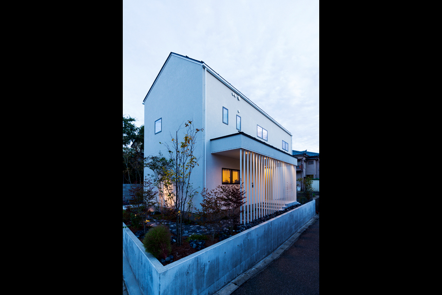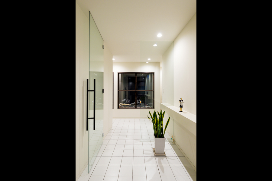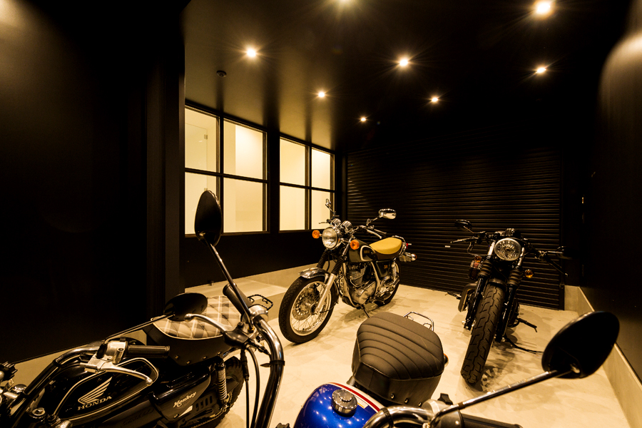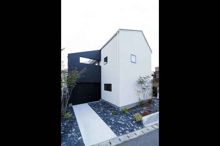 敷地の広さは55坪。南側には2階建の建物があり、北側の隣地よりも敷地が1.5mほど高くなっている。設計条件として、バイクを室内から眺めることのできるビルトインガレージを設けることと、住宅密集地のためプライバシーを守ることが条件として挙げられた。1Fには、南側にビルトインガレージを計画しその上部を2Fからのバルコニーとして使用できるように計画。また寝室・ウォークインクローゼットと個室2室を配置した。玄関には十分な広さのシュークローズを設置し、ホールよりガレージのバイクが眺める計画とした。2Fの南側にはガレージの上部であるバルコニーを壁で囲い、LDKを隣接させプライバシーを守りながらも十分な採光と通風を確保した。またLDKの北側の天井を屋根勾配に合わせた傾斜天井にし、トップライトを設けることで北側の安定した日照を確保するとともに、開放感のある居住空間を計画した。