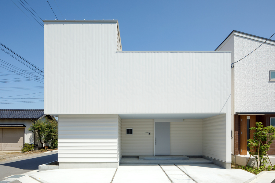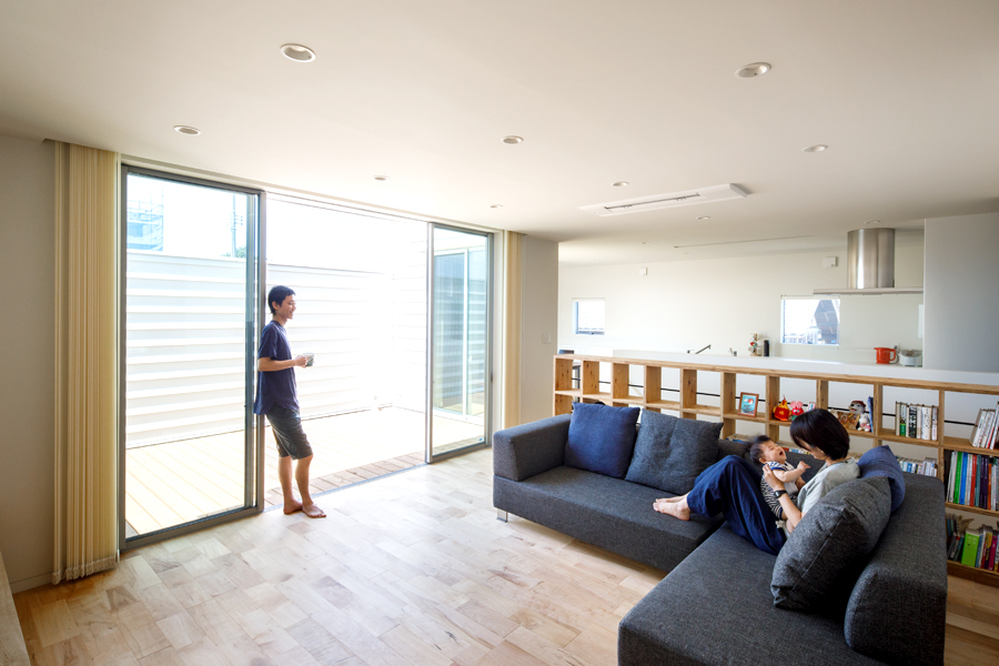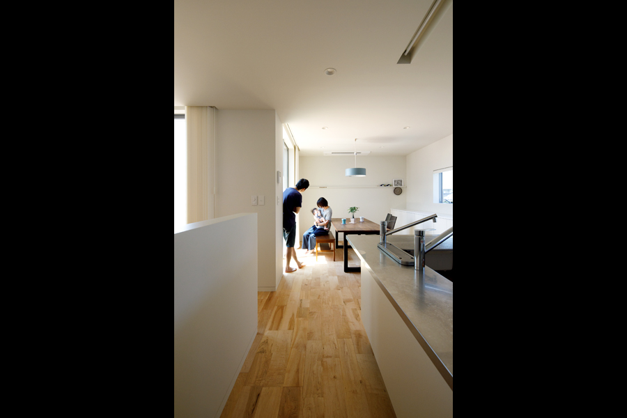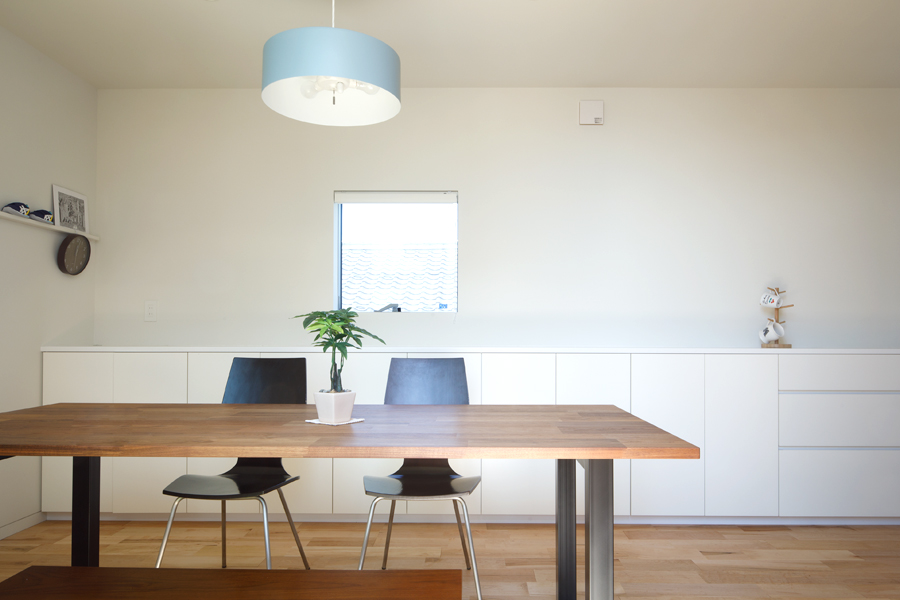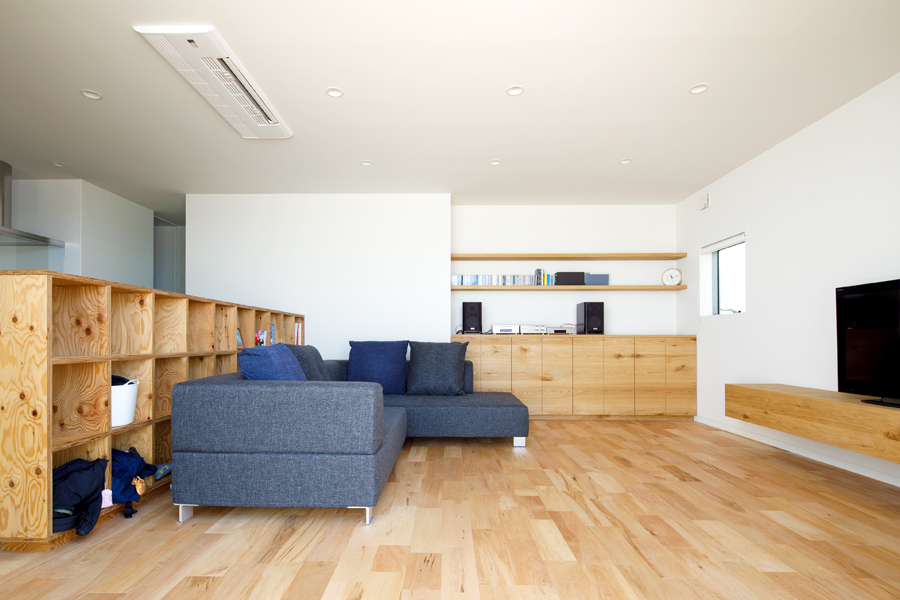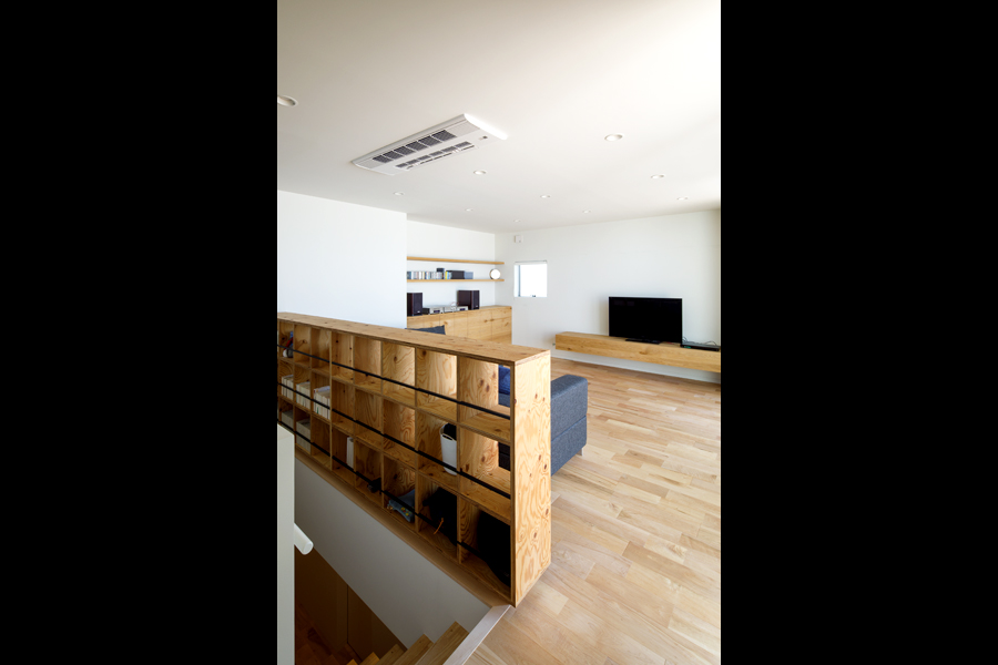 7区画ある分譲地で敷地の広さは38坪。外部からのプライバシーを守りながら、十分な採光と通風を採り入れる計画とした。1Fには、後々2部屋にする予定の子供室と寝室を配置した。収納スペースとして玄関には十分な広さのシュークローズを設置し、シューズ以外の収納も可能にした。2Fには12帖のリビングと13帖のダイニングキッチンをL型に配置。他、洗面室・脱衣室・浴室を配置した。リビングとダイニングには外部に繋がる10帖のバルコニーを配置し、LDKを隣接させることで十分な採光と通風を確保した。また、バルコニーには壁を建てプライバシーに配慮した。キッチンには十分な広さのパントリーを配置し収納を確保。洗面室と脱衣室を別々に設け、脱衣室では室内物干しができる広さを確保した。本棚やテレビカウンター、リビング収納などオリジナルで製作し、建物の空間に溶け込むように計画した。