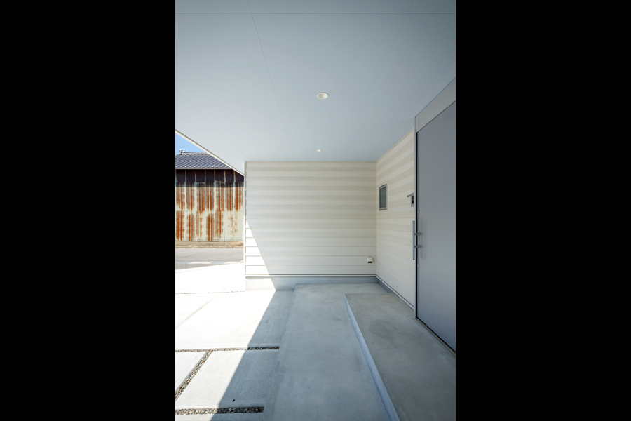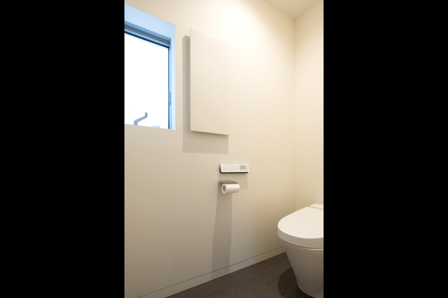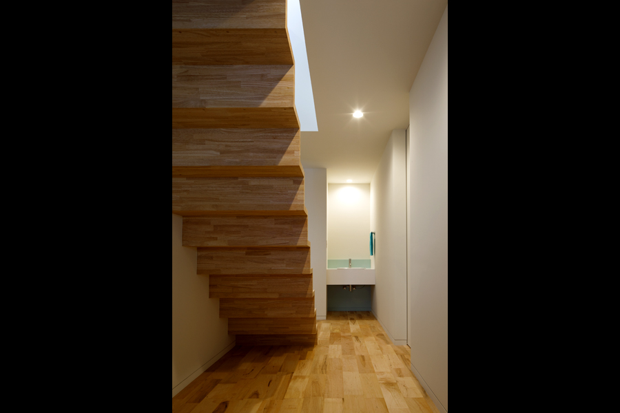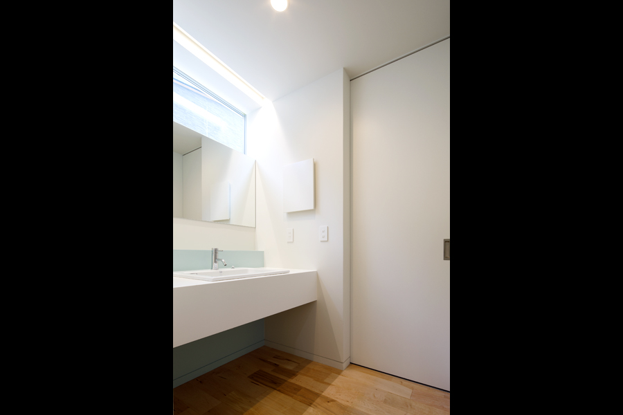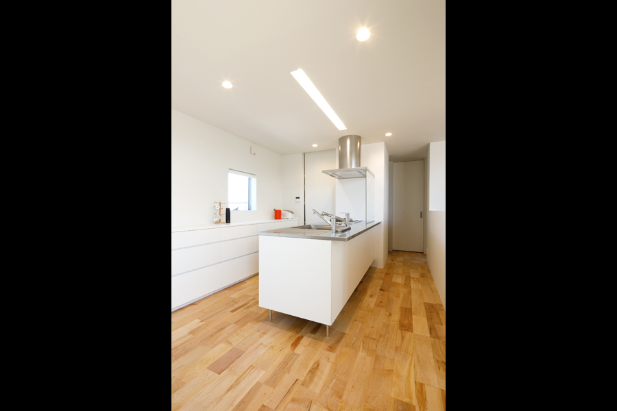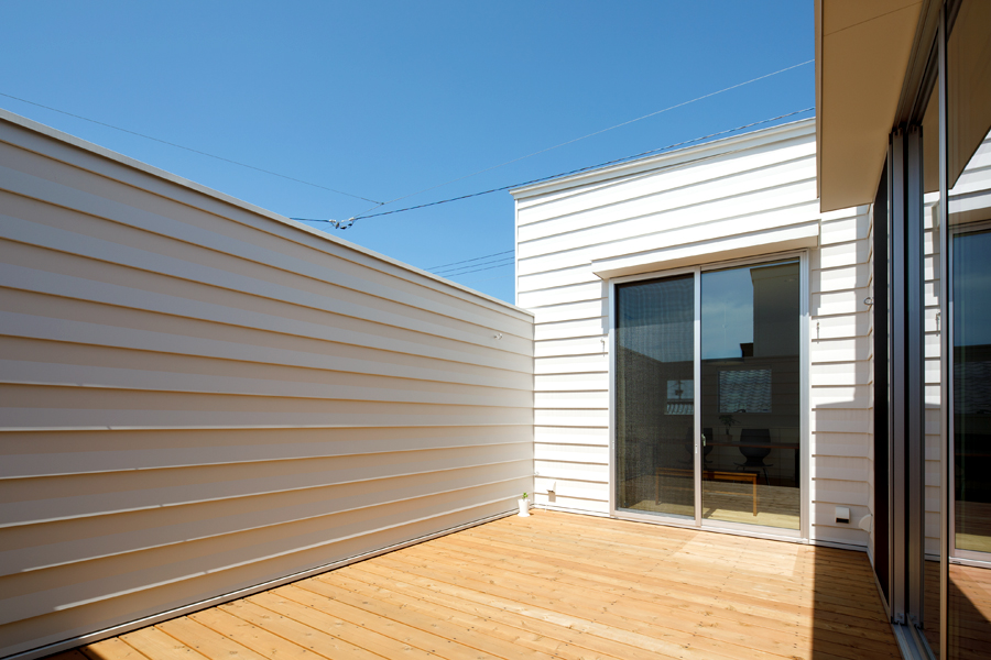 7区画ある分譲地で敷地の広さは38坪。外部からのプライバシーを守りながら、十分な採光と通風を採り入れる計画とした。1Fには、後々2部屋にする予定の子供室と寝室を配置した。収納スペースとして玄関には十分な広さのシュークローズを設置し、シューズ以外の収納も可能にした。2Fには12帖のリビングと13帖のダイニングキッチンをL型に配置。他、洗面室・脱衣室・浴室を配置した。リビングとダイニングには外部に繋がる10帖のバルコニーを配置し、LDKを隣接させることで十分な採光と通風を確保した。また、バルコニーには壁を建てプライバシーに配慮した。キッチンには十分な広さのパントリーを配置し収納を確保。洗面室と脱衣室を別々に設け、脱衣室では室内物干しができる広さを確保した。本棚やテレビカウンター、リビング収納などオリジナルで製作し、建物の空間に溶け込むように計画した。