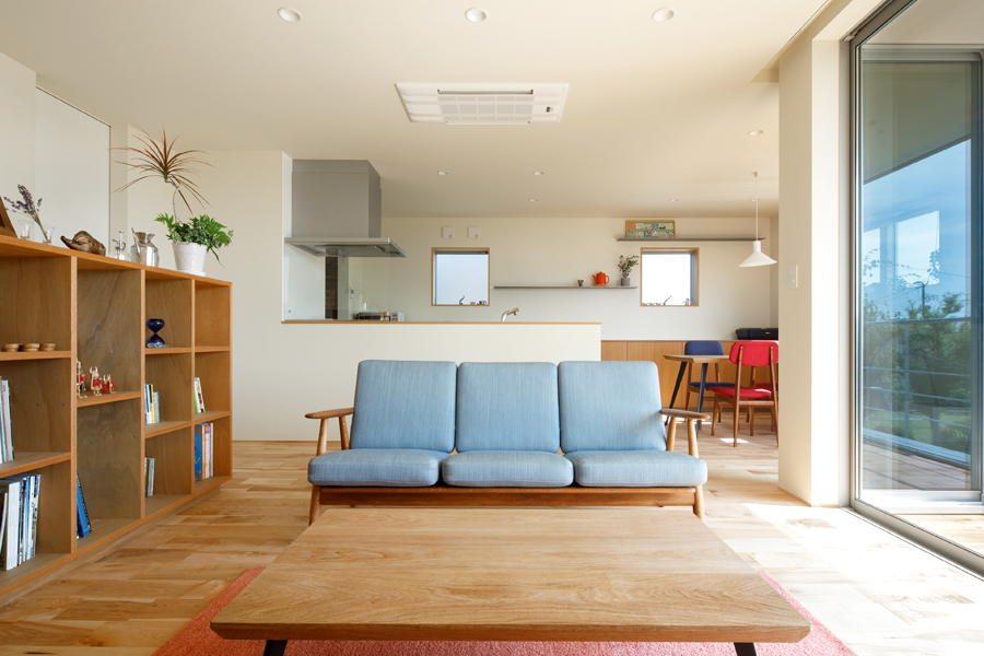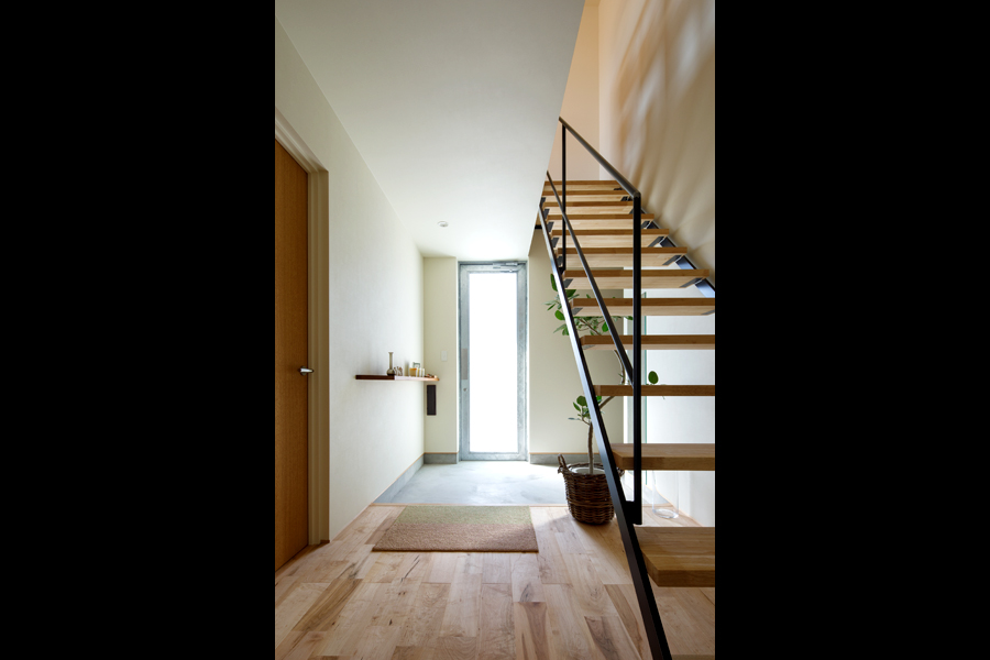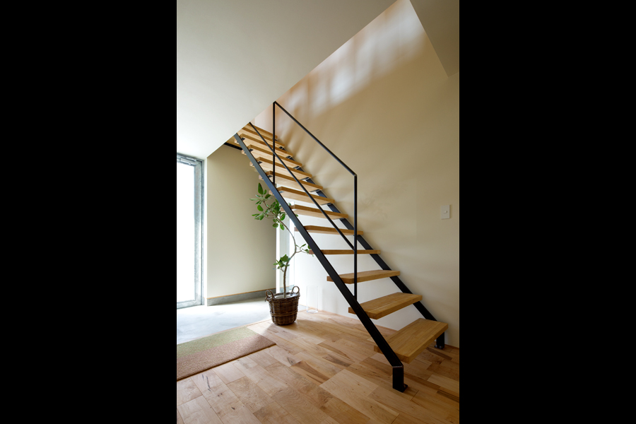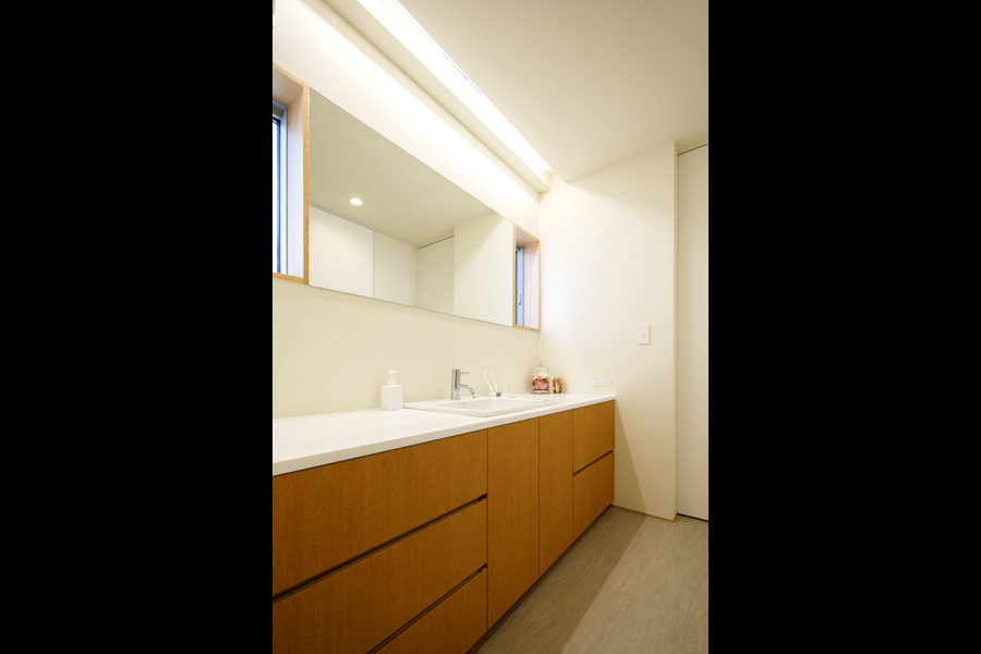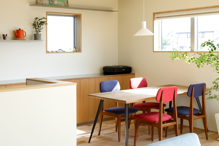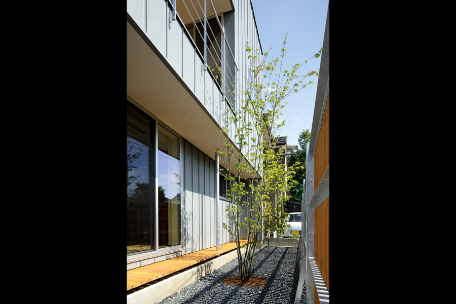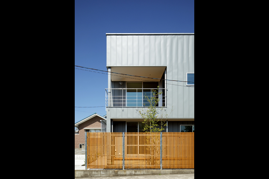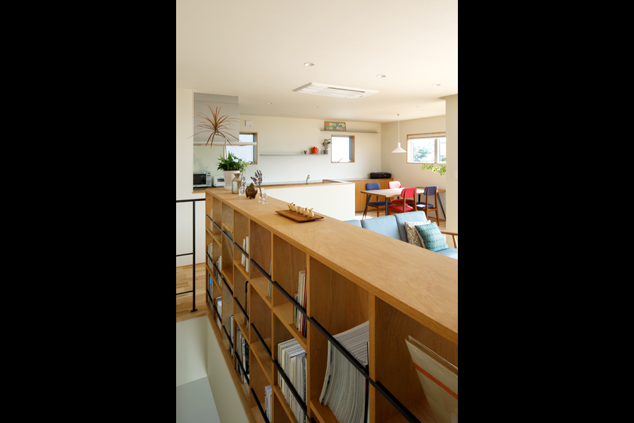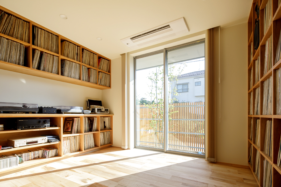 敷地の広さは54坪。1Fには趣味室と寝室を配置した。収納スペースとして玄関には十分な広さのシュークローズを設置し、シューズ以外の収納も可能にした。趣味室には庭に繋がるデッキを配置し植栽を望める計画とし、7000枚ほどのレコードを収納できるレコード棚を設置。2Fには20帖のLDKを南側に配置。他、洗面室・浴室・WCを配置した。リビングとダイニングには外部に繋がるバルコニーを隣接させることで十分な採光と通風を確保した。キッチンにはオリジナルの食器棚を設置し、十分な広さのパントリーも隣接させ収納を確保した。狭くなりがちな洗面室は室内物干しができる広さを確保した。本棚やテレビカウンターなどオリジナルで製作し、建物の空間に溶け込むように計画した。