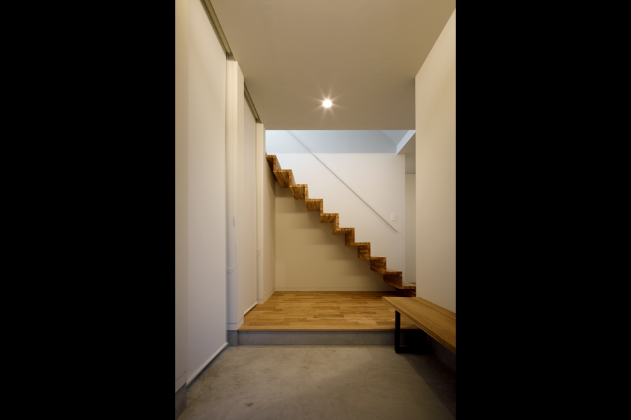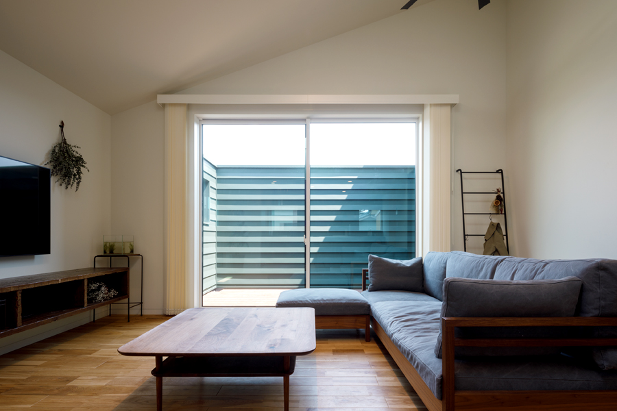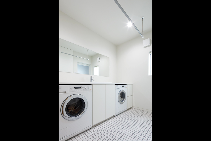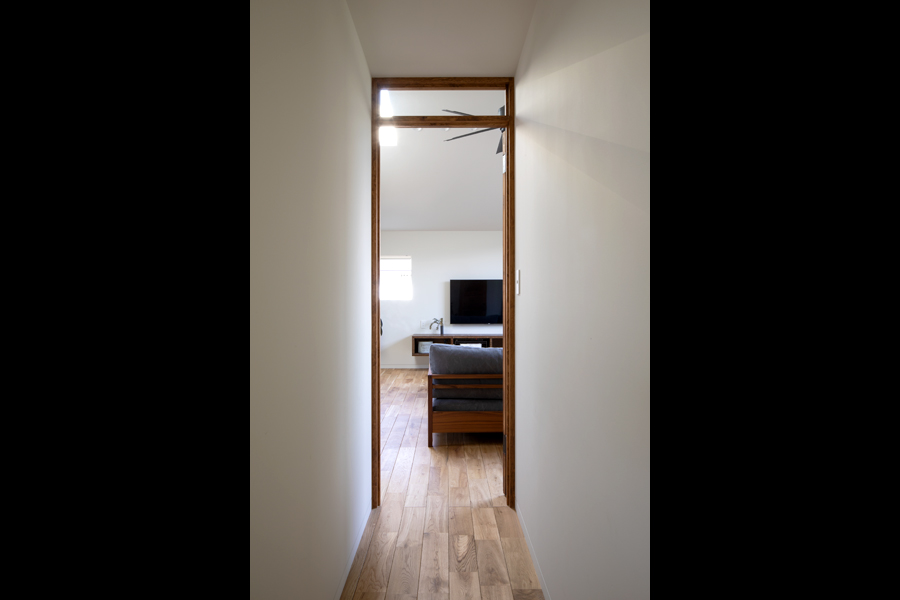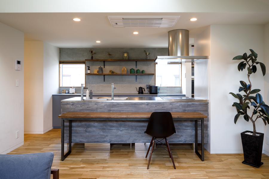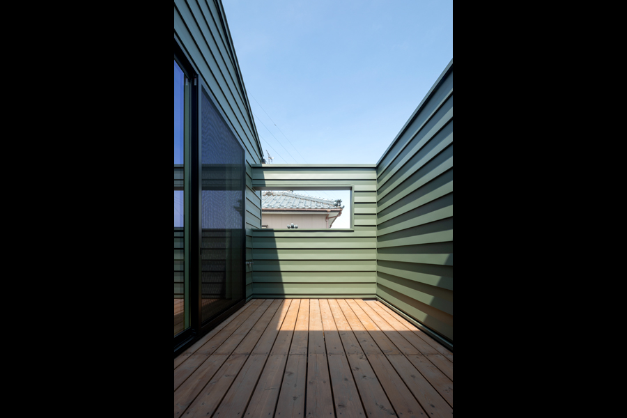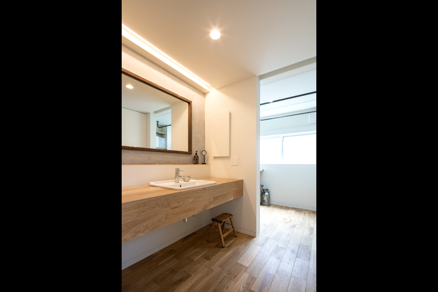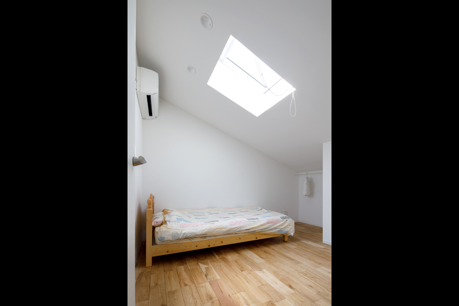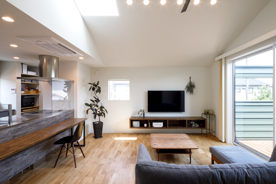 敷地の広さは45坪。1Fには、祖母の居住スペースとして寝室とリビング合わせて12帖を確保し、専用のサンルームを設置。玄関には、収納スペースとして十分な広さのシュークローズを設置し、シューズ以外の収納も可能にした。洗面室と浴室も1Fに配置し、洗面室にはビルトイン型の洗濯機を計画。2Fには、18帖のLDKとユーティリティースペース、寝室を配置。キッチンにはパントリーを設置し、オリジナルの食器収納を設置。リビングは勾配天井とし、トップライトを設け採光を確保。また、外部につながる6帖のバルコニーを隣接させ、十分な採光と通風を確保した。3Fには子供室と納戸を設置。勾配天井でつくられた子供室にもトップライトを設け、採光を確保。古材で製作したテレビカウンター、アンティークのドア、古材の飾り棚、オリジナルの洗面カウンターなど、空間にほどよくアクセントを与えている。