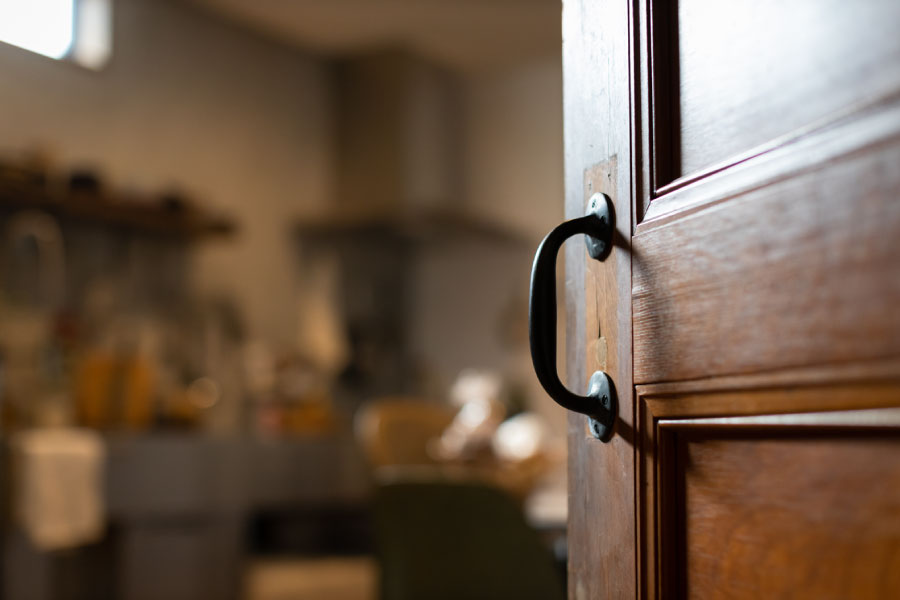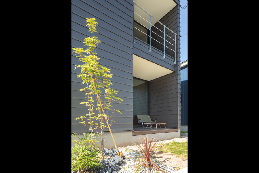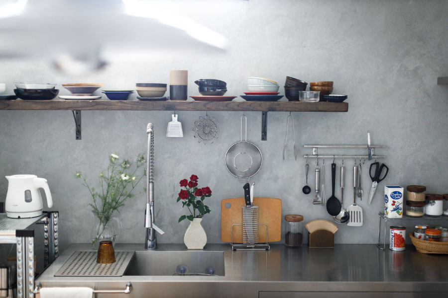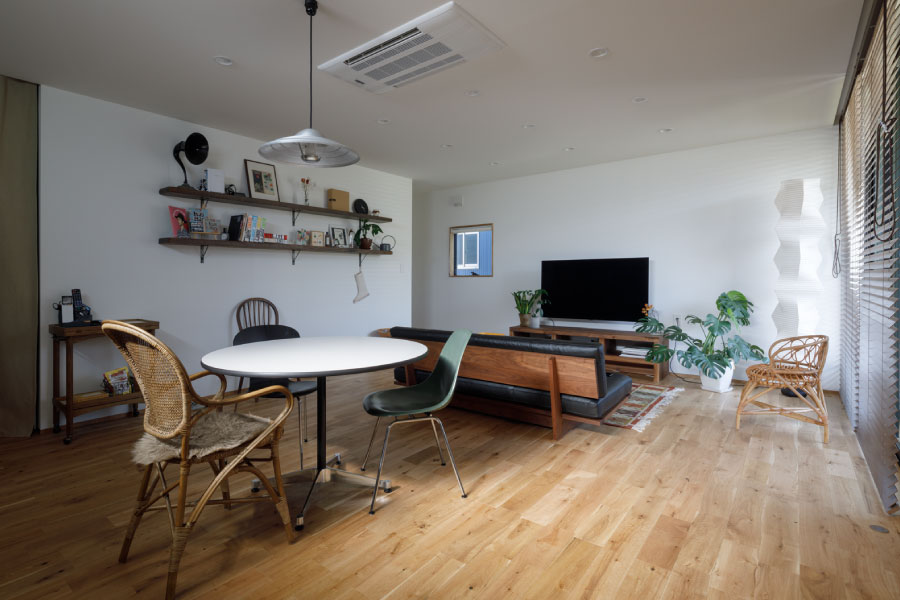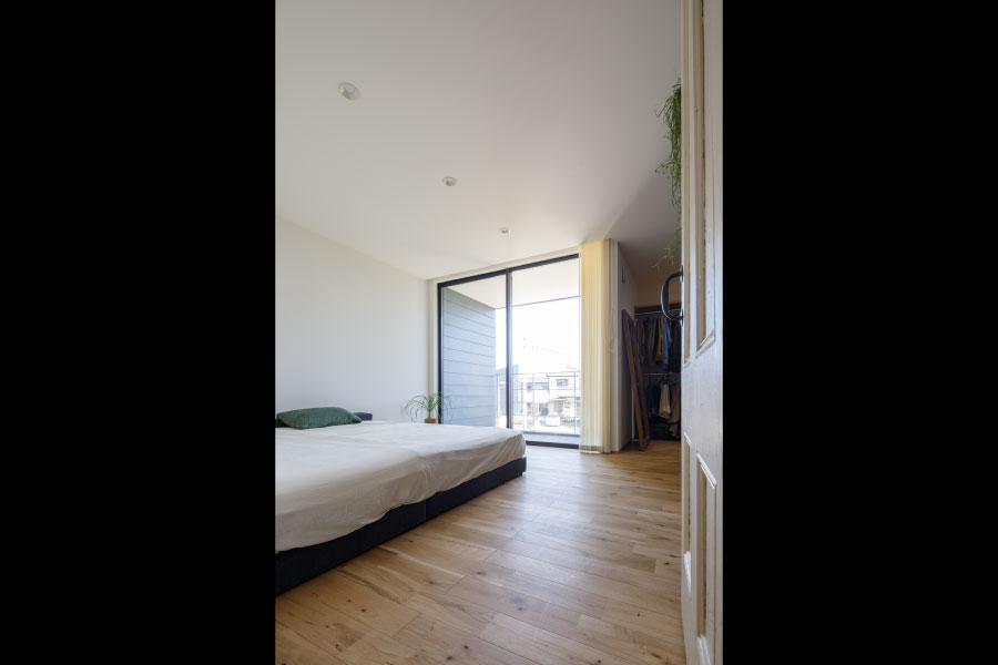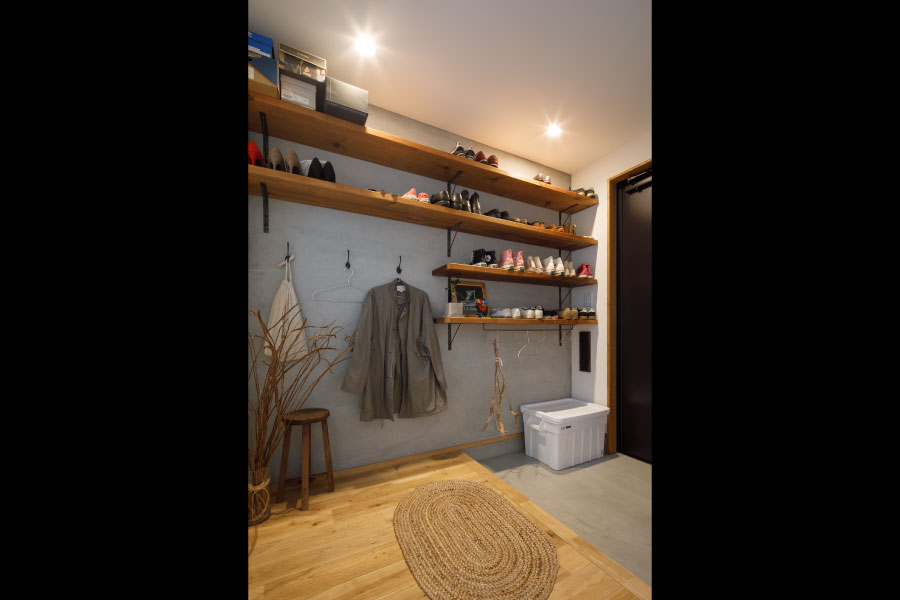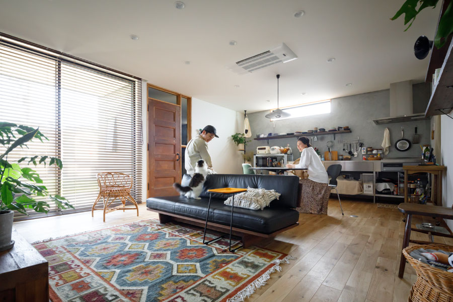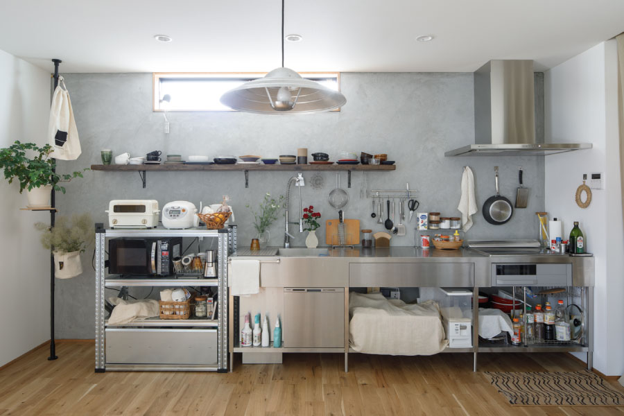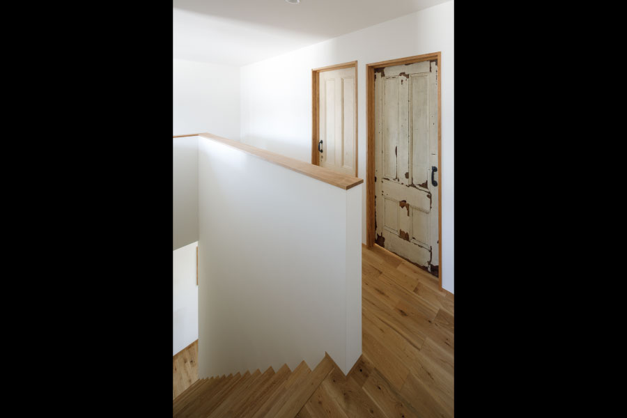 使い古されたアンティークドアを暮らしの中に入れ込みたい!そんな想いを取り入れて設計された住まい。デザイン全体的を使用感のある素材にもあうよう厳選。背面キッチンを採用して見せる収納を配置することでキッチン雑貨や家電もデザインに取り込んだ。キッチン上のFIX窓からの光がポイントになり暮らしに彩りを添えている。各階にデッキを設置することで外と内との間に余白を持たせてゆるやかに繋げている。オリジナルで製作された棚もアンティーク材を使い統一デザインで設置。LDKを一体化させて家族がどこにいても気配を感じ安心した暮しを提案した。