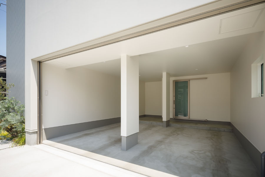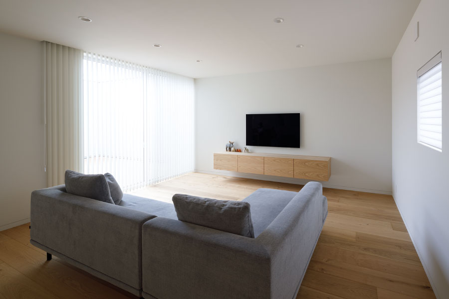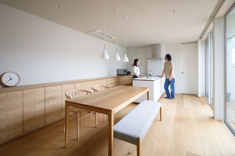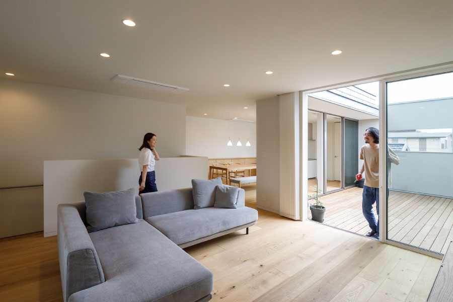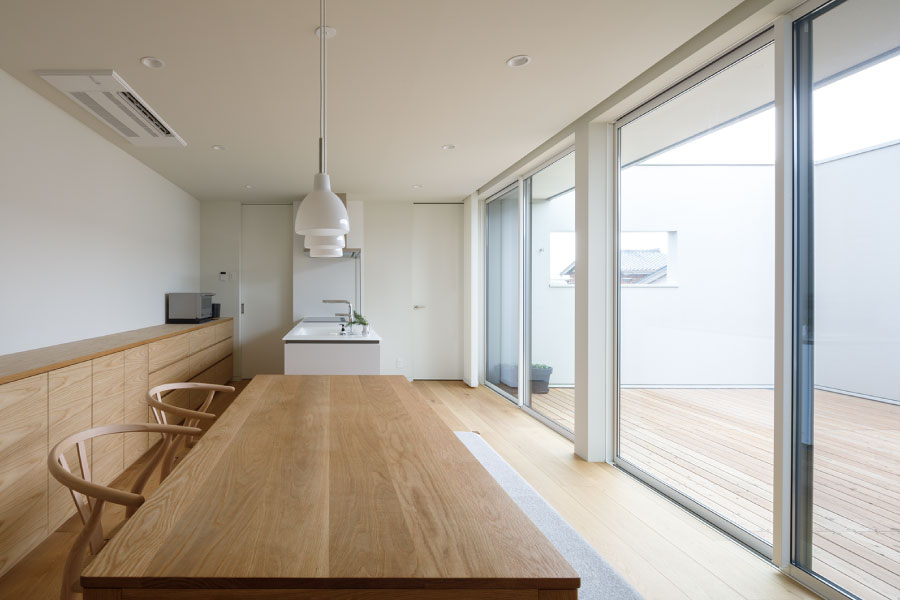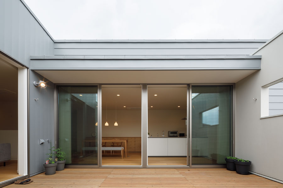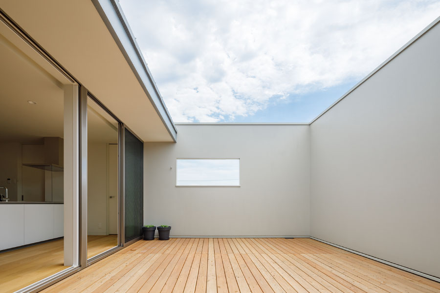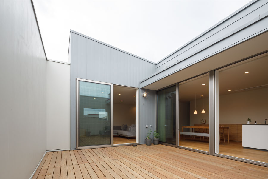 シンプルな箱が2つ。フラットな平面、無駄な線を省いたシンプルなデザインは室内に入っても全く同じように構成されている。外と内を違和感なくつなげた住まい。外観からは想像のできないプライベートデッキを囲む設計で優しい光と開放感抜群の空間をデザインしている。デッキではガーデニングを楽しんだりBBQをしたり夜空を見上げて毎日の暮らしをより上質に暮らしを楽しめる。