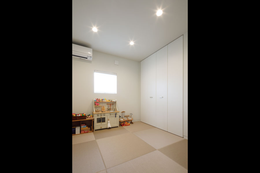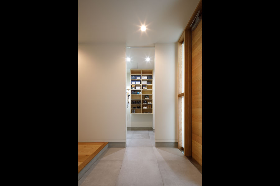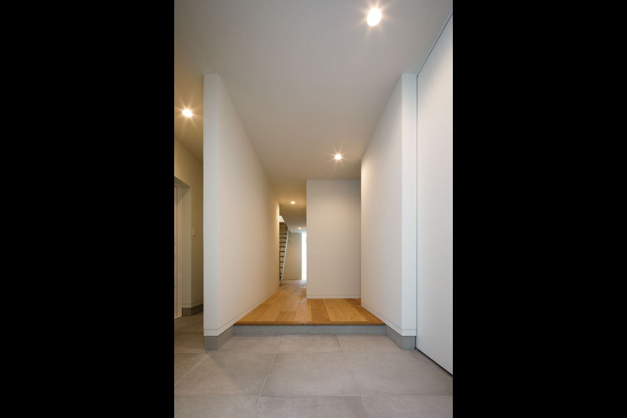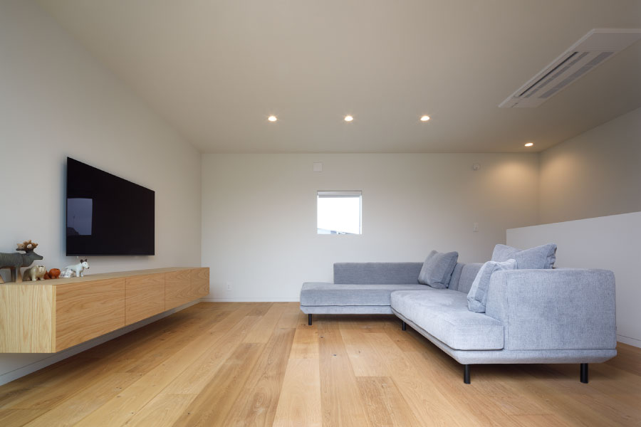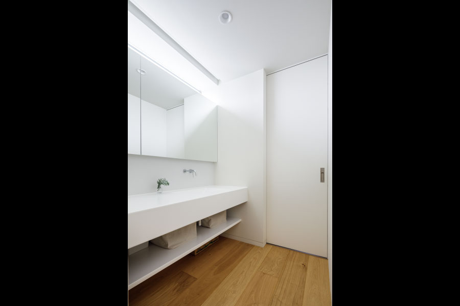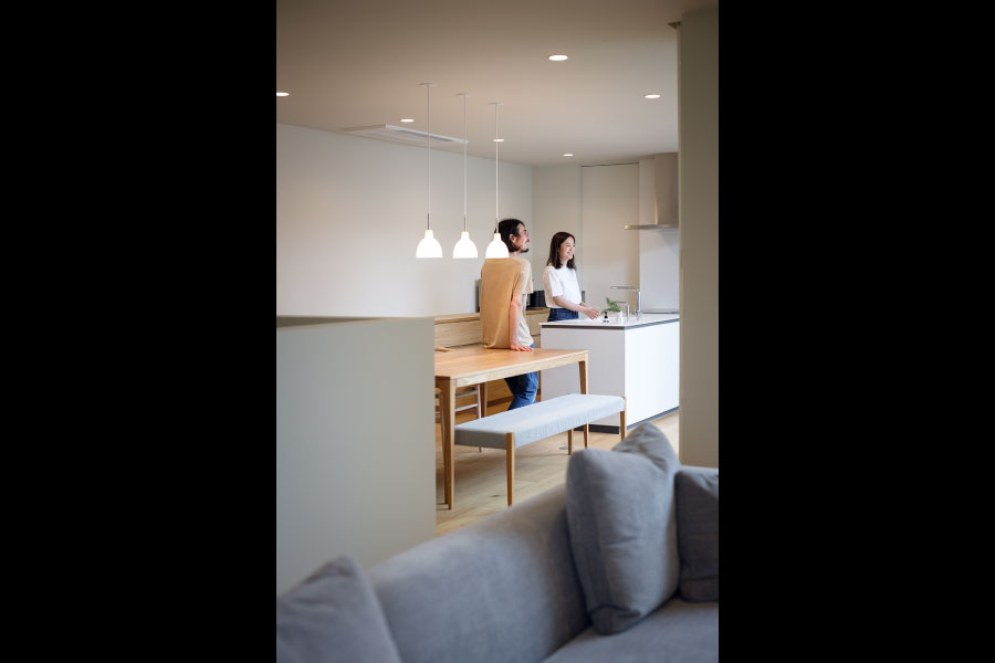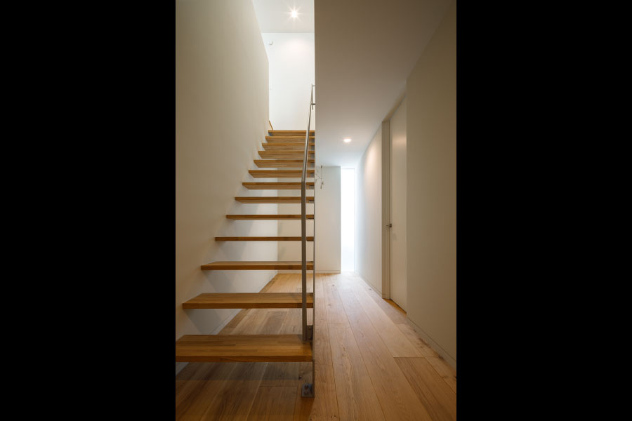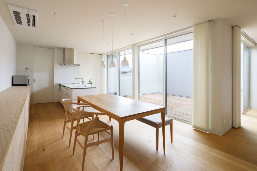 シンプルな箱が2つ。フラットな平面、無駄な線を省いたシンプルなデザインは室内に入っても全く同じように構成されている。外と内を違和感なくつなげた住まい。外観からは想像のできないプライベートデッキを囲む設計で優しい光と開放感抜群の空間をデザインしている。デッキではガーデニングを楽しんだりBBQをしたり夜空を見上げて毎日の暮らしをより上質に暮らしを楽しめる。