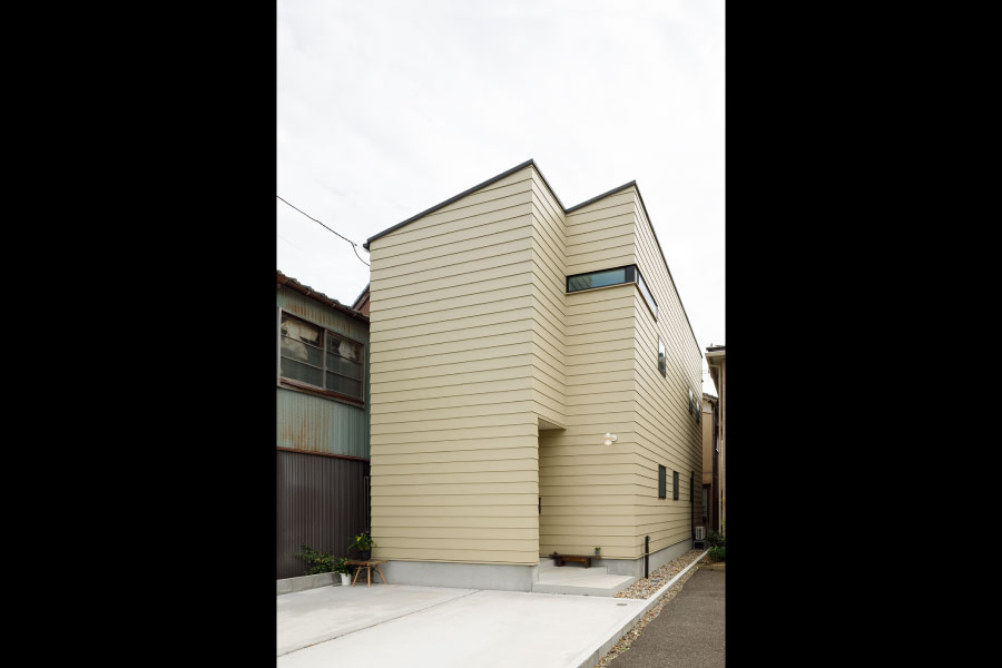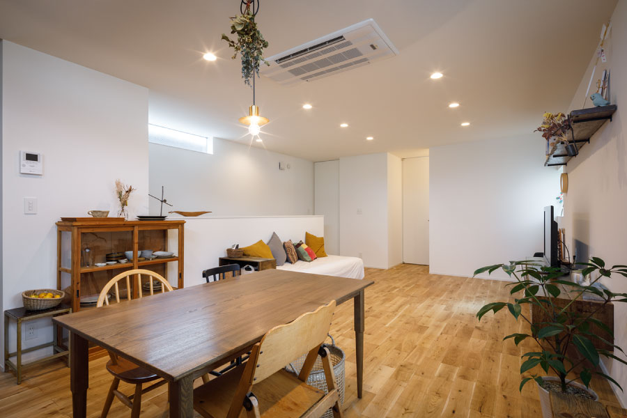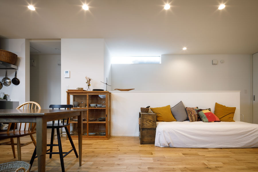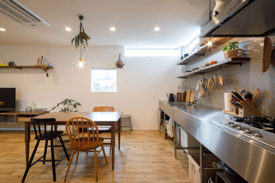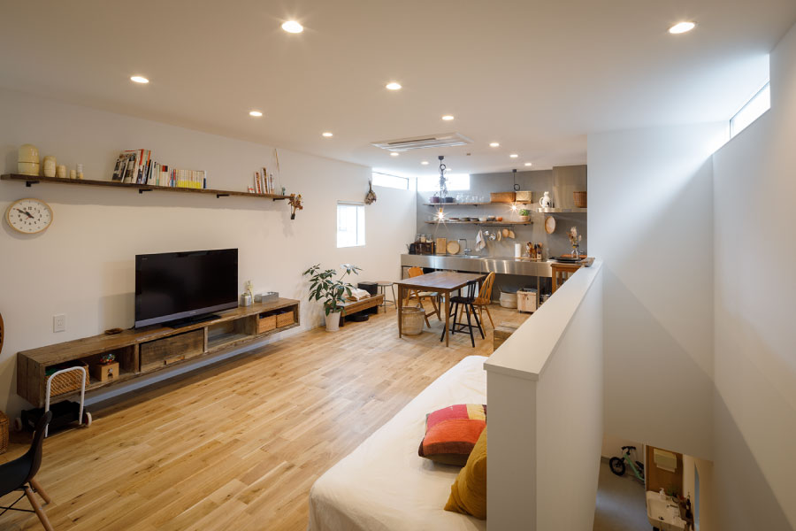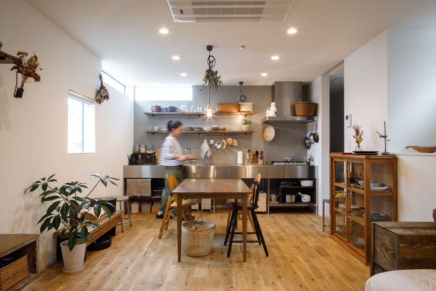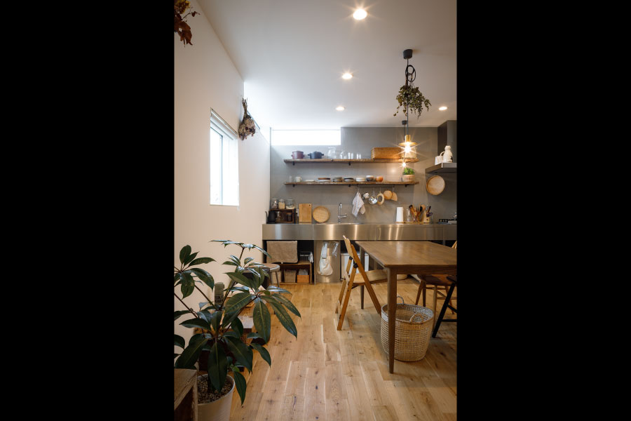 住宅街の中のうなぎの寝床のような変形地を明るく自由に暮らすため外に閉じて内に開く住まいを設計。オリジナルでライフスタイルに沿った設計だからこそ可能にしたシンプルな暮らし。古木をアクセントにオリジナルで棚を製作してインテリアと統一デザインで設計されている。