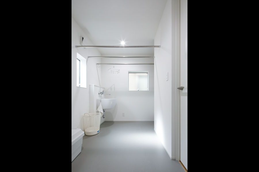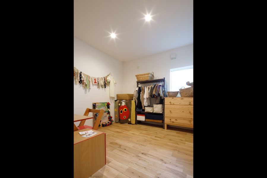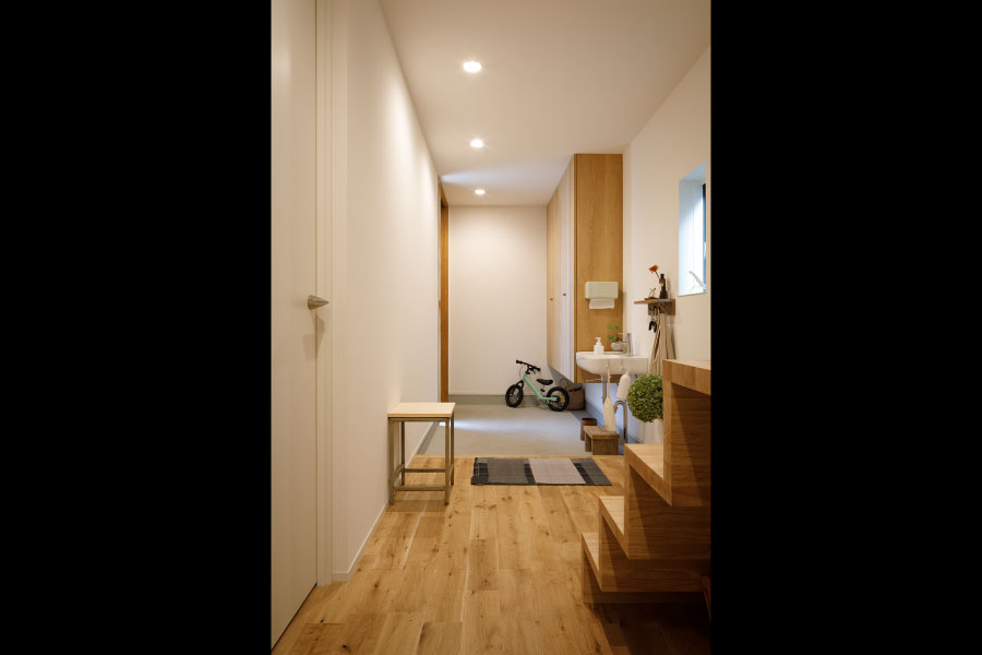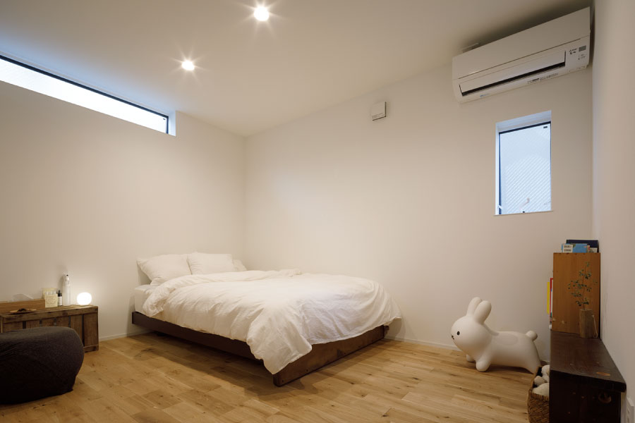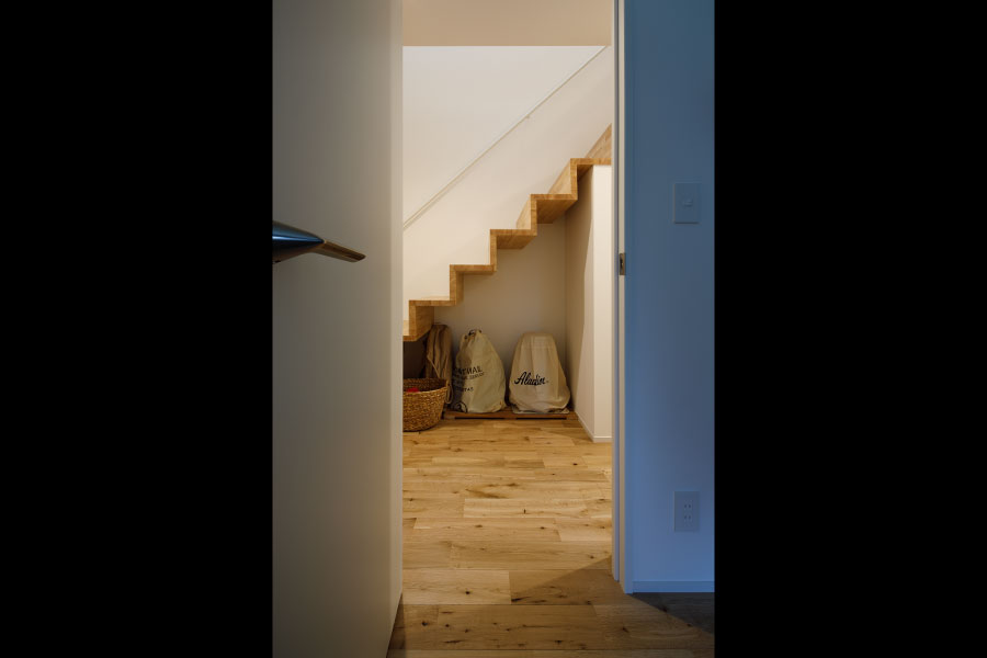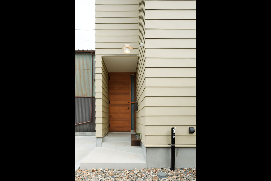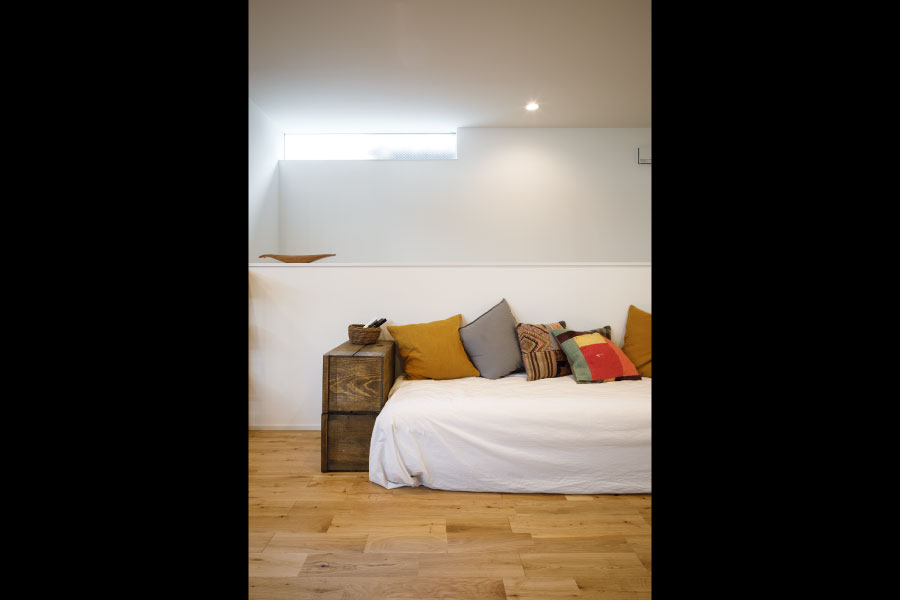 住宅街の中のうなぎの寝床のような変形地を明るく自由に暮らすため外に閉じて内に開く住まいを設計。オリジナルでライフスタイルに沿った設計だからこそ可能にしたシンプルな暮らし。古木をアクセントにオリジナルで棚を製作してインテリアと統一デザインで設計されている。