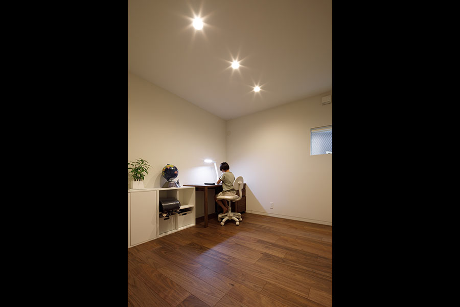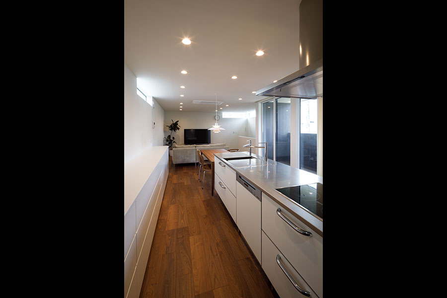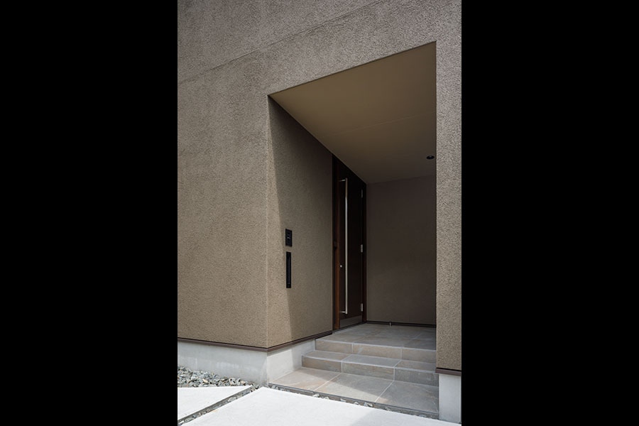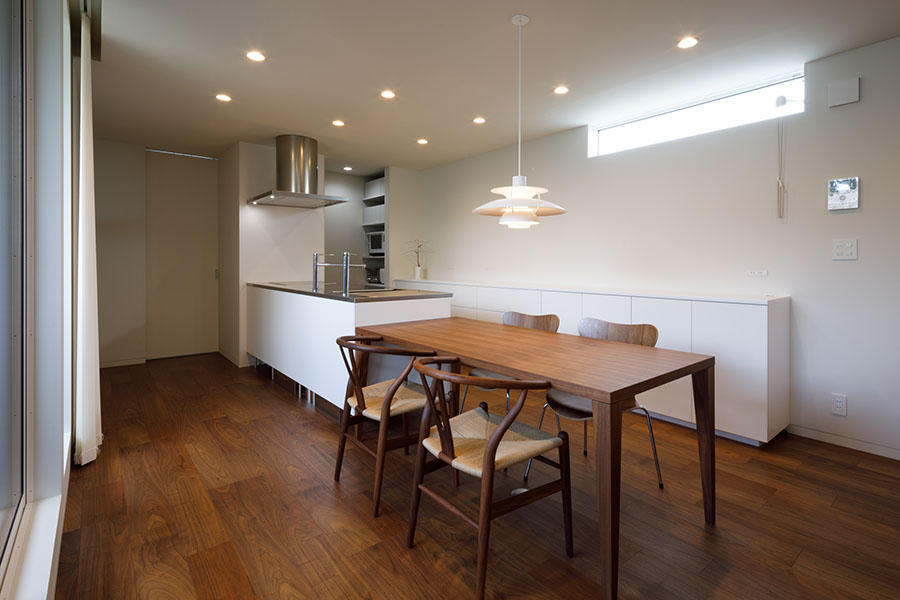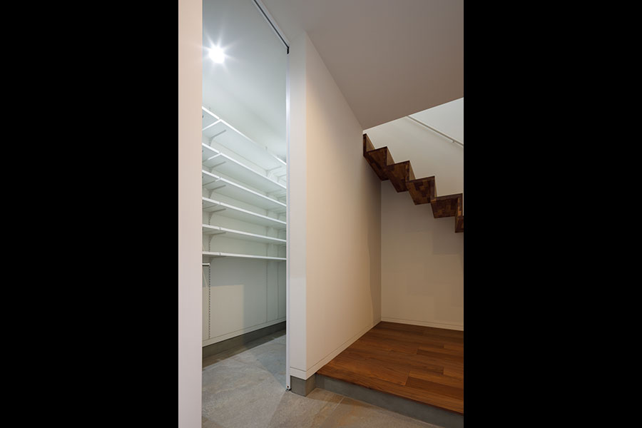 敷地の広さは38坪。立地環境を考慮し2Fリビング型を採用した。1Fには、寝室と個室を配置。玄関には十分な広さのシュークローズを設置し、シューズ以外の収納も可能にした。2Fには、20帖程のLDKと洗面室、浴室、ファミリークローゼットを配置。キッチン背面には、オリジナルの食器収納を設置、またパントリーを隣接させ収納量を確保。ダイニングにはバルコニーを設置し十分な採光と通風を確保した。狭くなりがちな洗面室には、Mieleのビルトイン洗濯機を採用したことでスペースを確保。外観、内観共に色のトーンを意識して計画し、全体がまとまりのある建物にした。