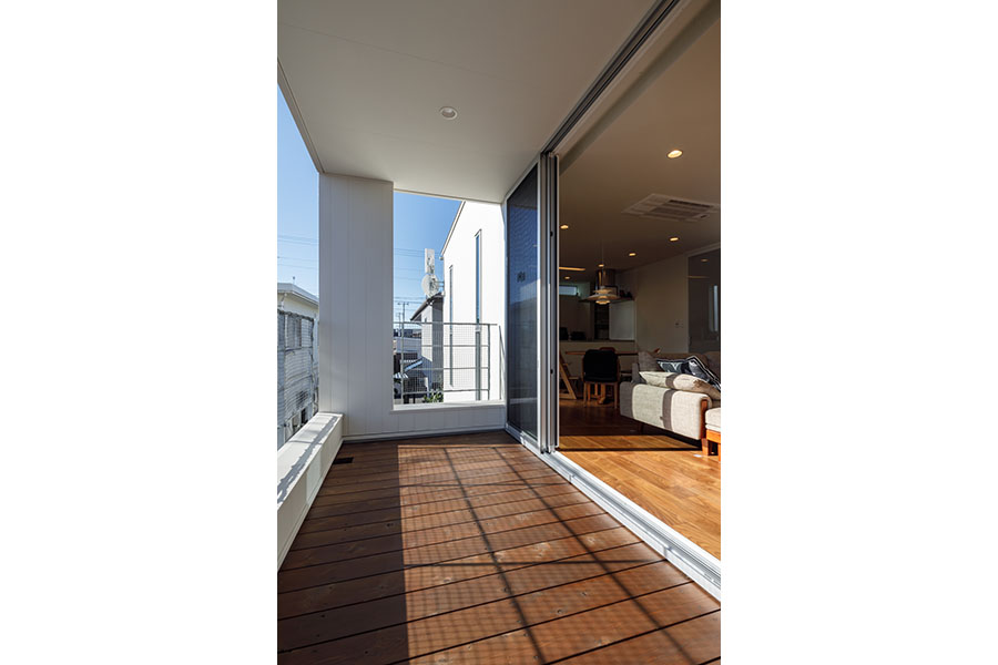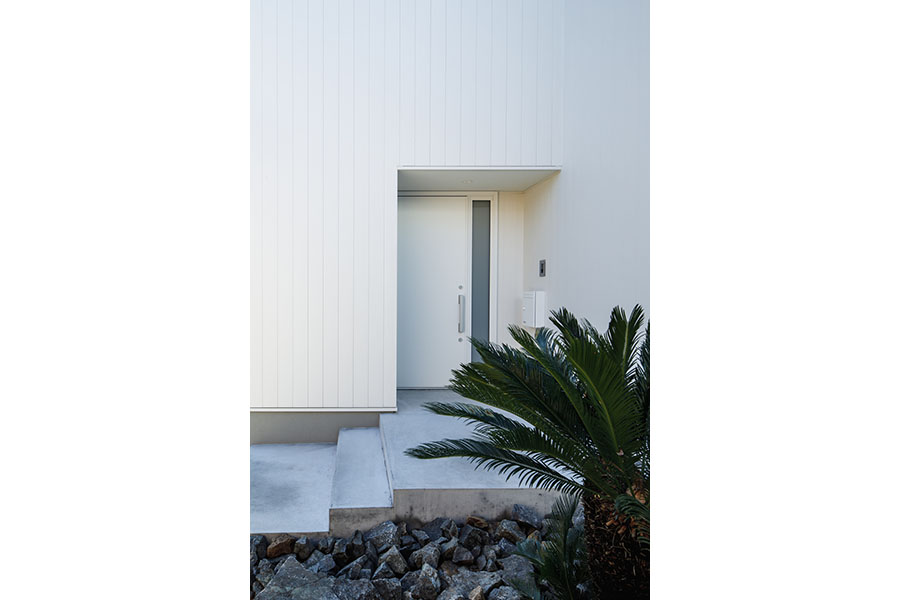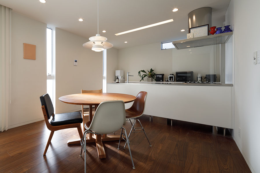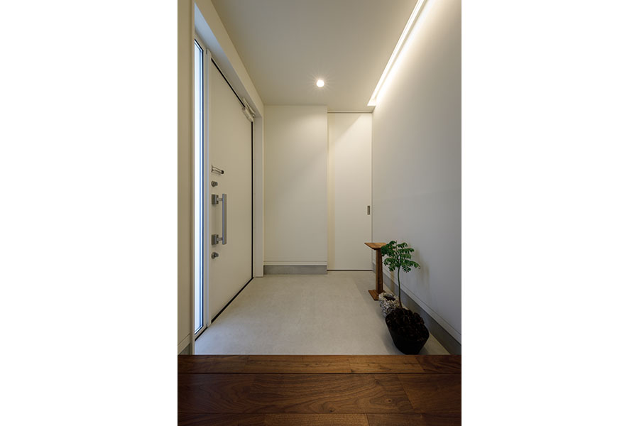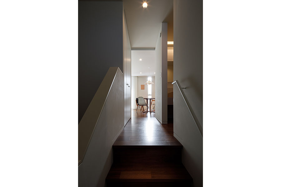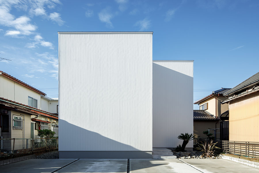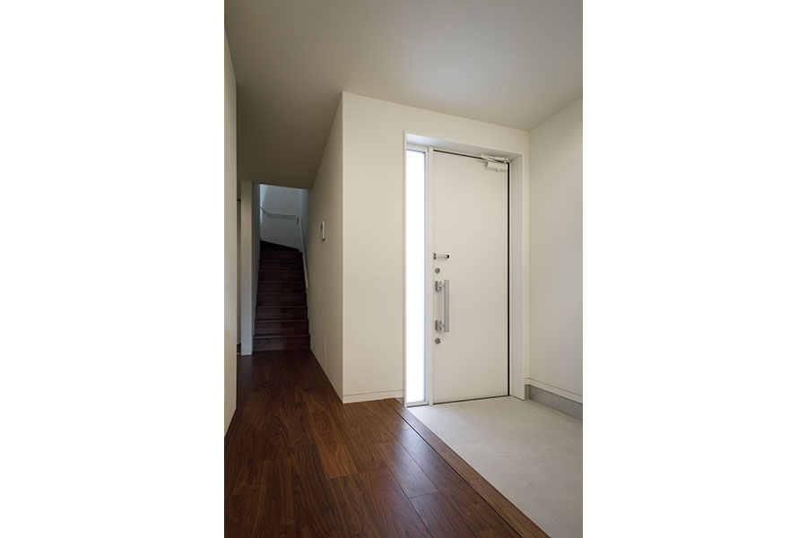 敷地は東向き広さは56坪。 間口が広く正方形に近い形状で隣地にはすでに建物が近接している。 周辺環境により2F リビング型を採用。 玄関には十分な広さのシューズクロークを備えてシューズ以 外の収納も可能。 1F には寝室、 個室2部屋、 ウォークインクローゼットを配置。 2F にリビング、 ダイニングキッチン、 脱衣室、 浴室を配置。 南に開けている部分に広さ4帖のバルコニーを計画し、 リビングに隣接させ十分な採光と通風を確保。 キッチンにはオリジナルのバックカウンターを設置。 パントリーも隣接させ収納を確保。 室内の天井や壁面は白で統一し、 床材にはウォールナットのフローリングを採用。 細部のディテールを丁寧に仕上げたシンプルで普遍的な内装に仕上がっており、 限られた敷地の中でお施主様のこだわりと意匠をつなげた建物。