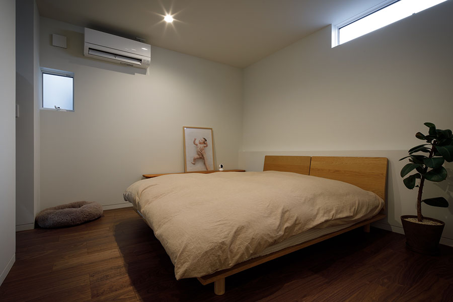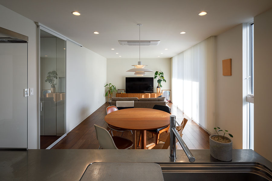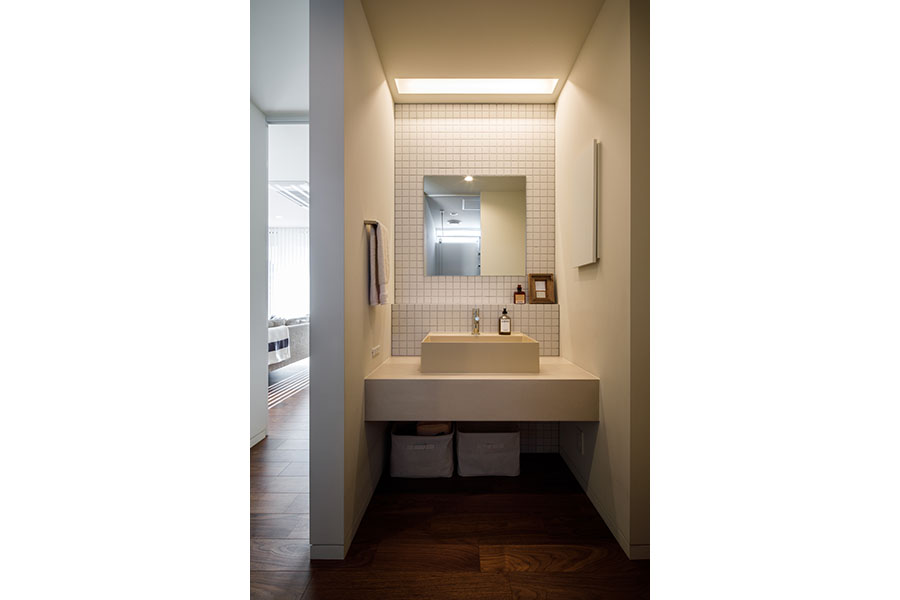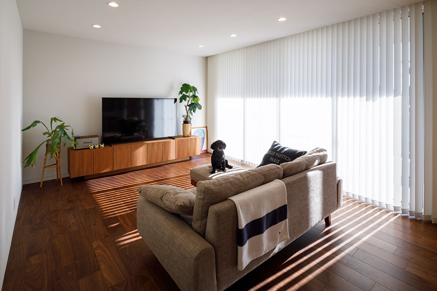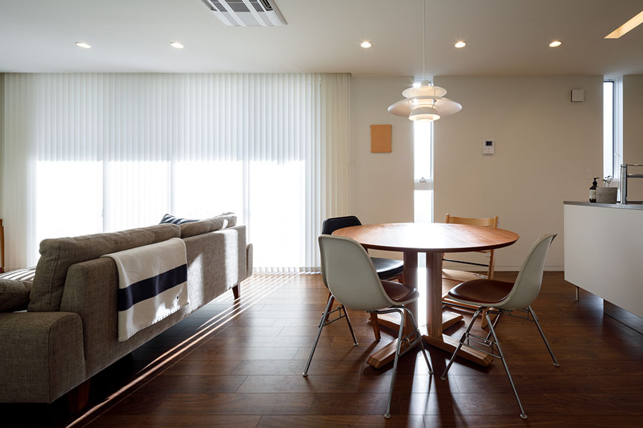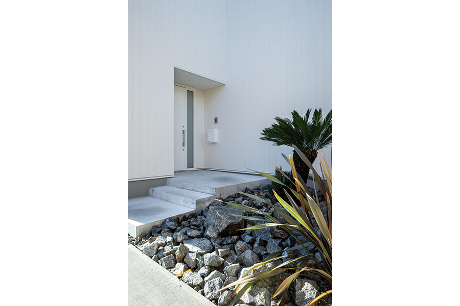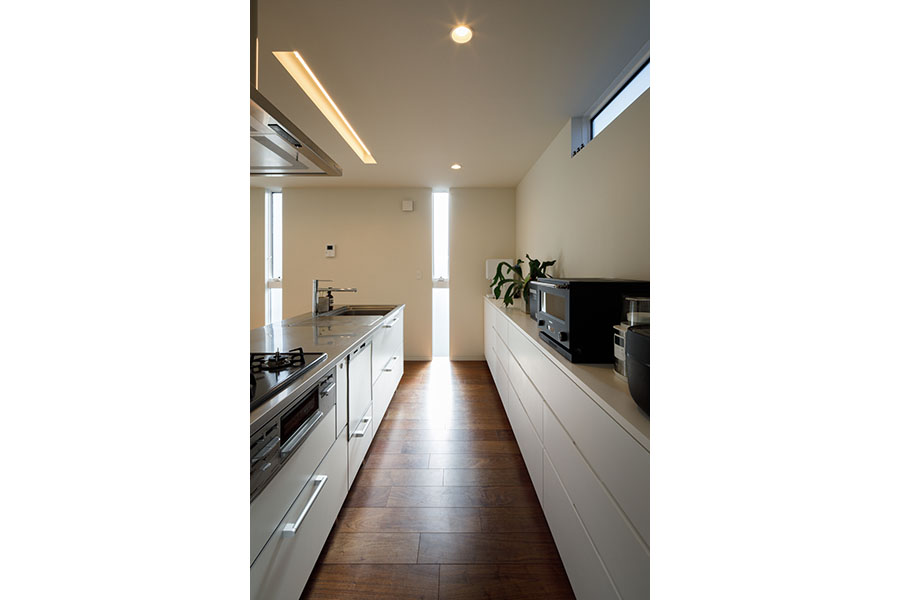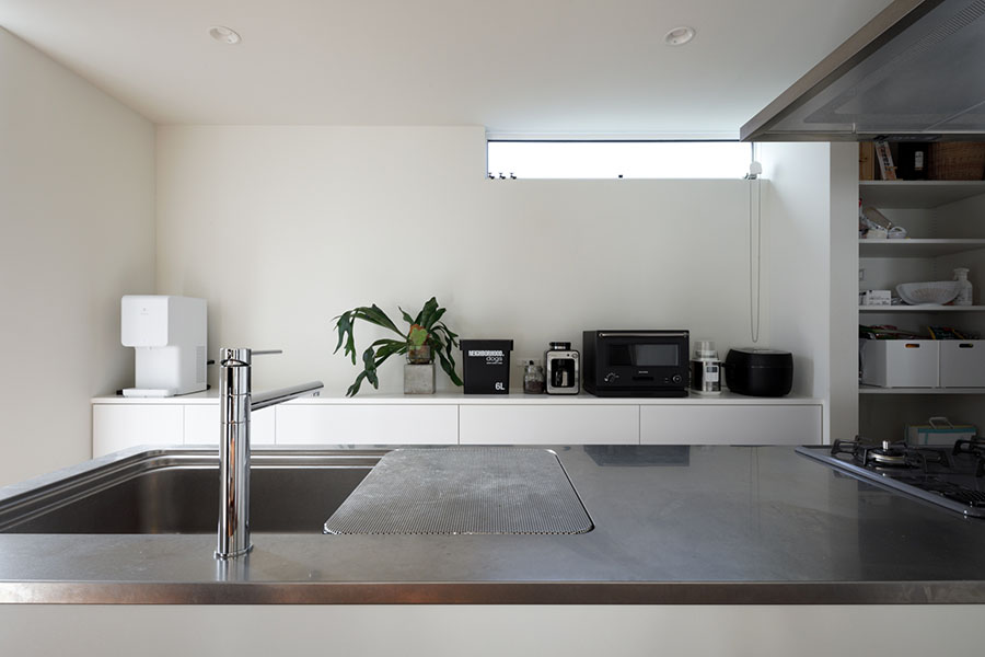 敷地は東向き広さは56坪。 間口が広く正方形に近い形状で隣地にはすでに建物が近接している。 周辺環境により2F リビング型を採用。 玄関には十分な広さのシューズクロークを備えてシューズ以 外の収納も可能。 1F には寝室、 個室2部屋、 ウォークインクローゼットを配置。 2F にリビング、 ダイニングキッチン、 脱衣室、 浴室を配置。 南に開けている部分に広さ4帖のバルコニーを計画し、 リビングに隣接させ十分な採光と通風を確保。 キッチンにはオリジナルのバックカウンターを設置。 パントリーも隣接させ収納を確保。 室内の天井や壁面は白で統一し、 床材にはウォールナットのフローリングを採用。 細部のディテールを丁寧に仕上げたシンプルで普遍的な内装に仕上がっており、 限られた敷地の中でお施主様のこだわりと意匠をつなげた建物。